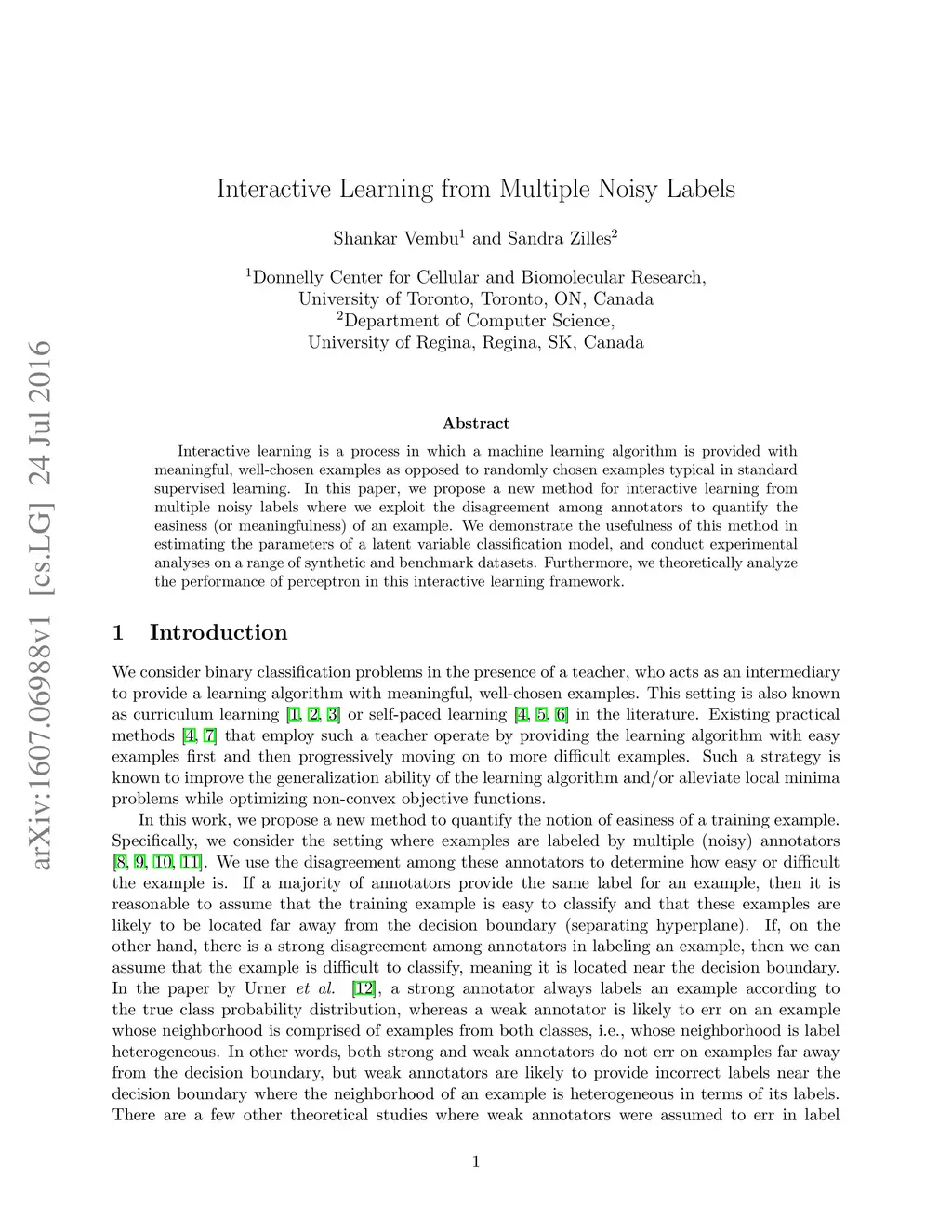 Interactive learning is a process in which a machine learning algorithm is provided with meaningful, well-chosen examples as opposed to randomly chosen examples typical in standard supervised learning. In this paper, we propose a new method for interactive learning from multiple noisy labels where we exploit the disagreement among annotators to quantify the easiness (or meaningfulness) of an example. We demonstrate the usefulness of this method in estimating the parameters of a latent variable classification model, and conduct experimental analyses on a range of synthetic and benchmark datasets. Furthermore, we theoretically analyze the performance of perceptron in this interactive learning framework.