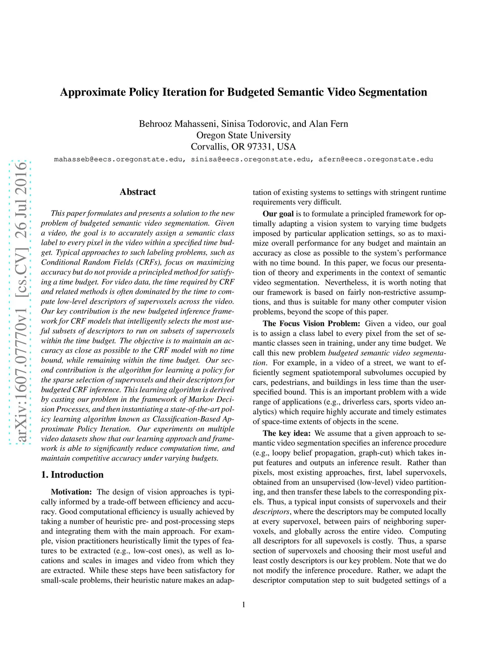 Approximate Policy Iteration for Budgeted Semantic Video Segmentation