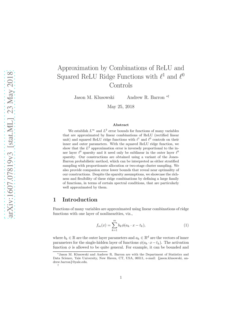 We establish $ L^{\infty} $ and $ L^2 $ error bounds for functions of many variables that are approximated by linear combinations of ReLU (rectified linear unit) and squared ReLU ridge functions with $ \ell^1 $ and $ \ell^0 $ controls on their inner and outer parameters. With the squared ReLU ridge function, we show that the $ L^2 $ approximation error is inversely proportional to the inner layer $ \ell^0 $ sparsity and it need only be sublinear in the outer layer $ \ell^0 $ sparsity. Our constructions are obtained using a variant of the Jones-Barron probabilistic method, which can be interpreted as either stratified sampling with proportionate allocation or two-stage cluster sampling. We also provide companion error lower bounds that reveal near optimality of our constructions. Despite the sparsity assumptions, we showcase the richness and flexibility of these ridge combinations by defining a large family of functions, in terms of certain spectral conditions, that are particularly well approximated by them.