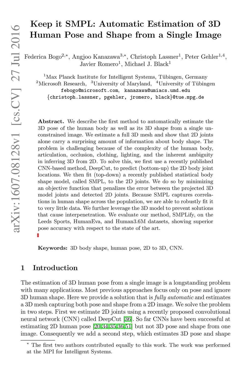 Keep it SMPL: Automatic Estimation of 3D Human Pose and Shape from a