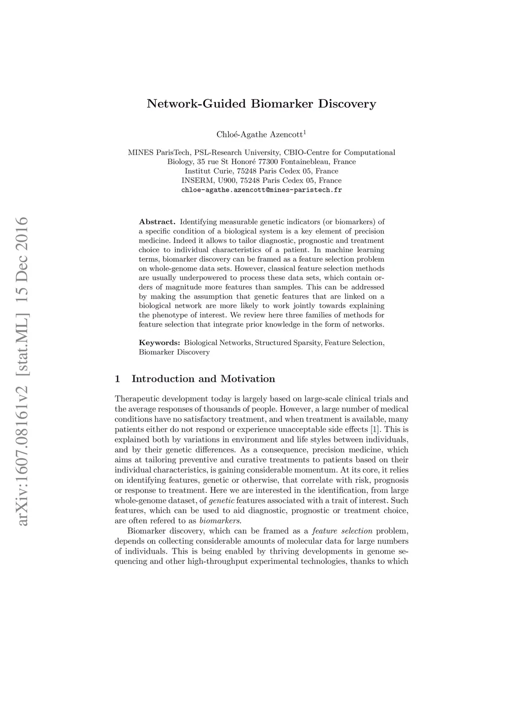 Identifying measurable genetic indicators (or biomarkers) of a specific condition of a biological system is a key element of precision medicine. Indeed it allows to tailor diagnostic, prognostic and treatment choice to individual characteristics of a patient. In machine learning terms, biomarker discovery can be framed as a feature selection problem on whole-genome data sets. However, classical feature selection methods are usually underpowered to process these data sets, which contain orders of magnitude more features than samples. This can be addressed by making the assumption that genetic features that are linked on a biological network are more likely to work jointly towards explaining the phenotype of interest. We review here three families of methods for feature selection that integrate prior knowledge in the form of networks.