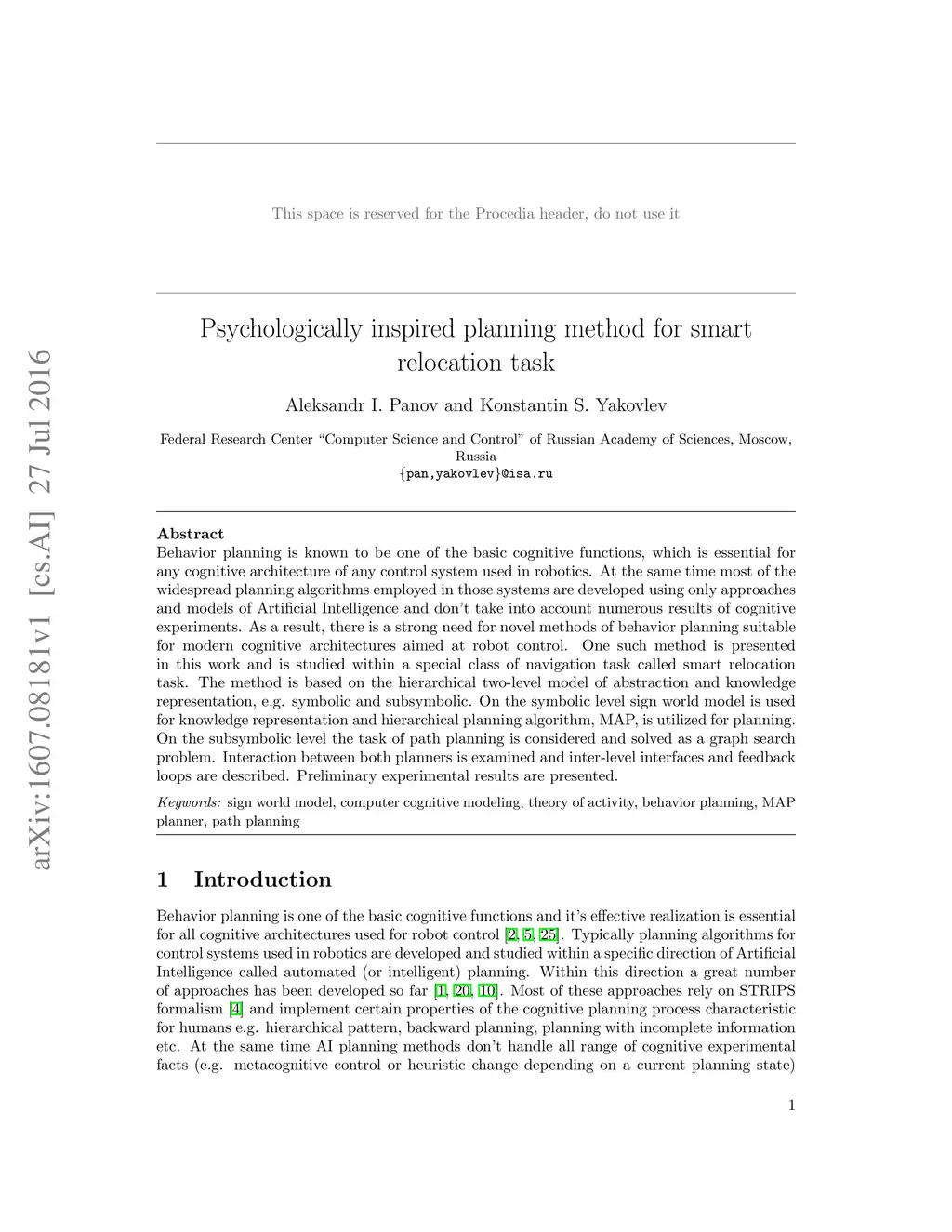 Psychologically inspired planning method for smart relocation task