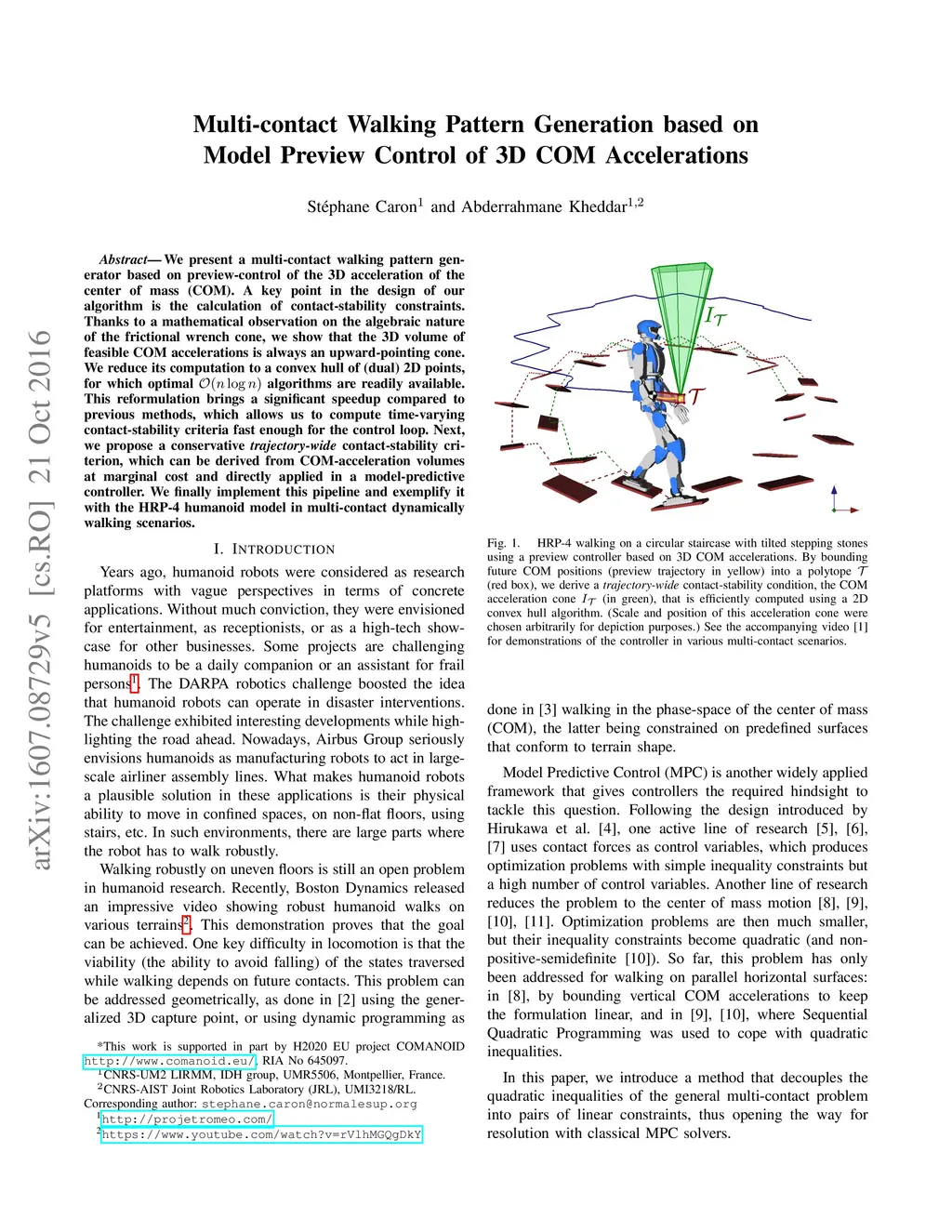 We present a multi-contact walking pattern generator based on preview-control of the 3D acceleration of the center of mass (COM). A key point in the design of our algorithm is the calculation of contact-stability constraints. Thanks to a mathematical observation on the algebraic nature of the frictional wrench cone, we show that the 3D volume of feasible COM accelerations is a always a downward-pointing cone. We reduce its computation to a convex hull of (dual) 2D points, for which optimal O(n log n) algorithms are readily available. This reformulation brings a significant speedup compared to previous methods, which allows us to compute time-varying contact-stability criteria fast enough for the control loop. Next, we propose a conservative trajectory-wide contact-stability criterion, which can be derived from COM-acceleration volumes at marginal cost and directly applied in a model-predictive controller. We finally implement this pipeline and exemplify it with the HRP-4 humanoid model in multi-contact dynamically walking scenarios.