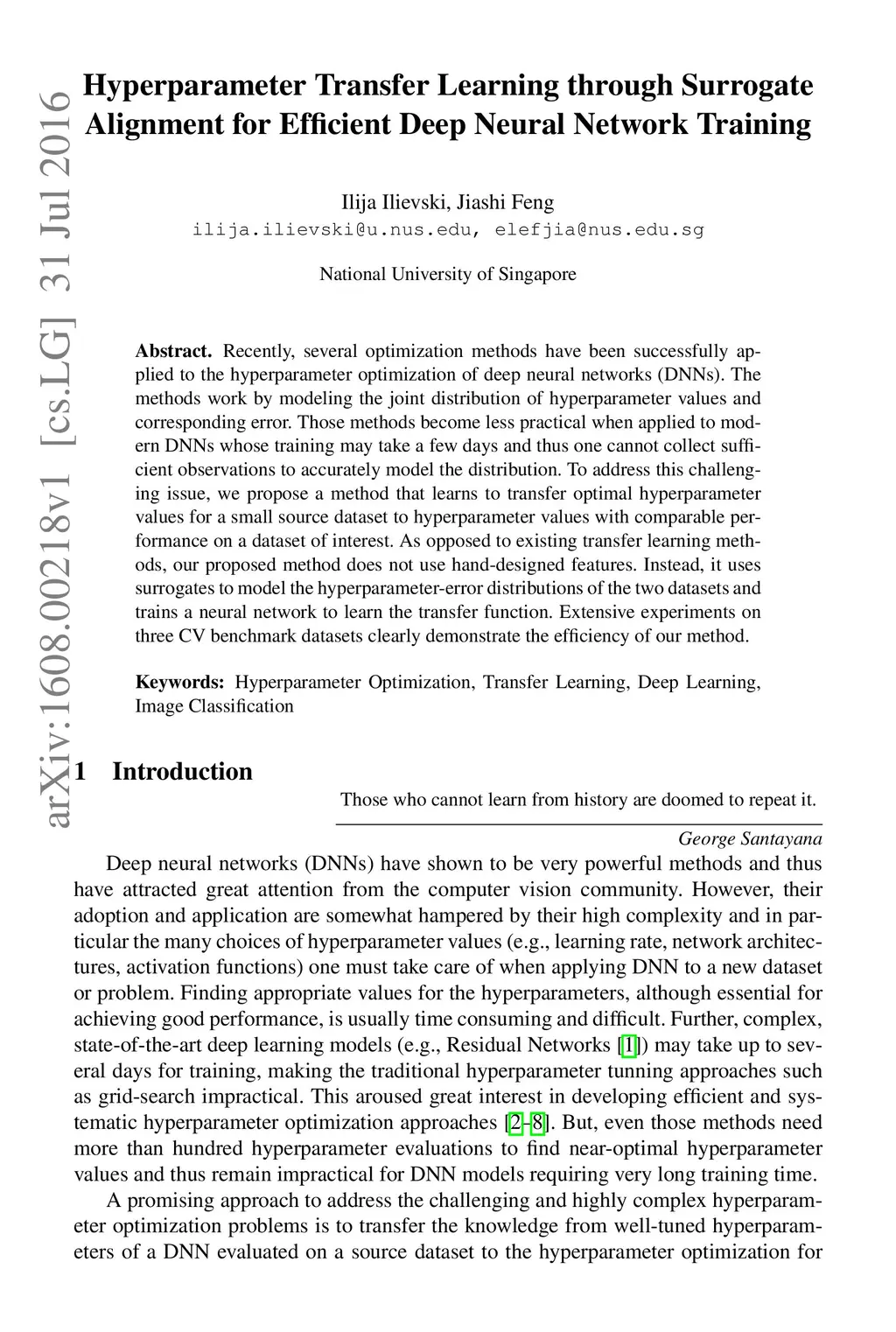 Recently, several optimization methods have been successfully applied to the hyperparameter optimization of deep neural networks (DNNs). The methods work by modeling the joint distribution of hyperparameter values and corresponding error. Those methods become less practical when applied to modern DNNs whose training may take a few days and thus one cannot collect sufficient observations to accurately model the distribution. To address this challenging issue, we propose a method that learns to transfer optimal hyperparameter values for a small source dataset to hyperparameter values with comparable performance on a dataset of interest. As opposed to existing transfer learning methods, our proposed method does not use hand-designed features. Instead, it uses surrogates to model the hyperparameter-error distributions of the two datasets and trains a neural network to learn the transfer function. Extensive experiments on three CV benchmark datasets clearly demonstrate the efficiency of our method.
