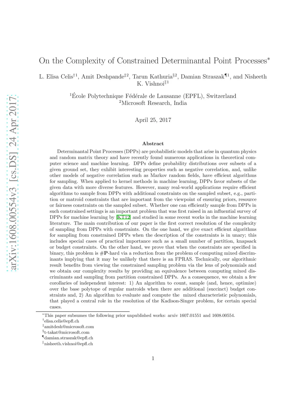 Determinantal Point Processes (DPPs) are probabilistic models that arise in quantum physics and random matrix theory and have recently found numerous applications in computer science. DPPs define distributions over subsets of a given ground set, they exhibit interesting properties such as negative correlation, and, unlike other models, have efficient algorithms for sampling. When applied to kernel methods in machine learning, DPPs favor subsets of the given data with more diverse features. However, many real-world applications require efficient algorithms to sample from DPPs with additional constraints on the subset, e.g., partition or matroid constraints that are important to ensure priors, resource or fairness constraints on the sampled subset. Whether one can efficiently sample from DPPs in such constrained settings is an important problem that was first raised in a survey of DPPs by \cite{KuleszaTaskar12} and studied in some recent works in the machine learning literature. The main contribution of our paper is the first resolution of the complexity of sampling from DPPs with constraints. We give exact efficient algorithms for sampling from constrained DPPs when their description is in unary. Furthermore, we prove that when the constraints are specified in binary, this problem is #P-hard via a reduction from the problem of computing mixed discriminants implying that it may be unlikely that there is an FPRAS. Our results benefit from viewing the constrained sampling problem via the lens of polynomials. Consequently, we obtain a few algorithms of independent interest: 1) to count over the base polytope of regular matroids when there are additional (succinct) budget constraints and, 2) to evaluate and compute the mixed characteristic polynomials, that played a central role in the resolution of the Kadison-Singer problem, for certain special cases.