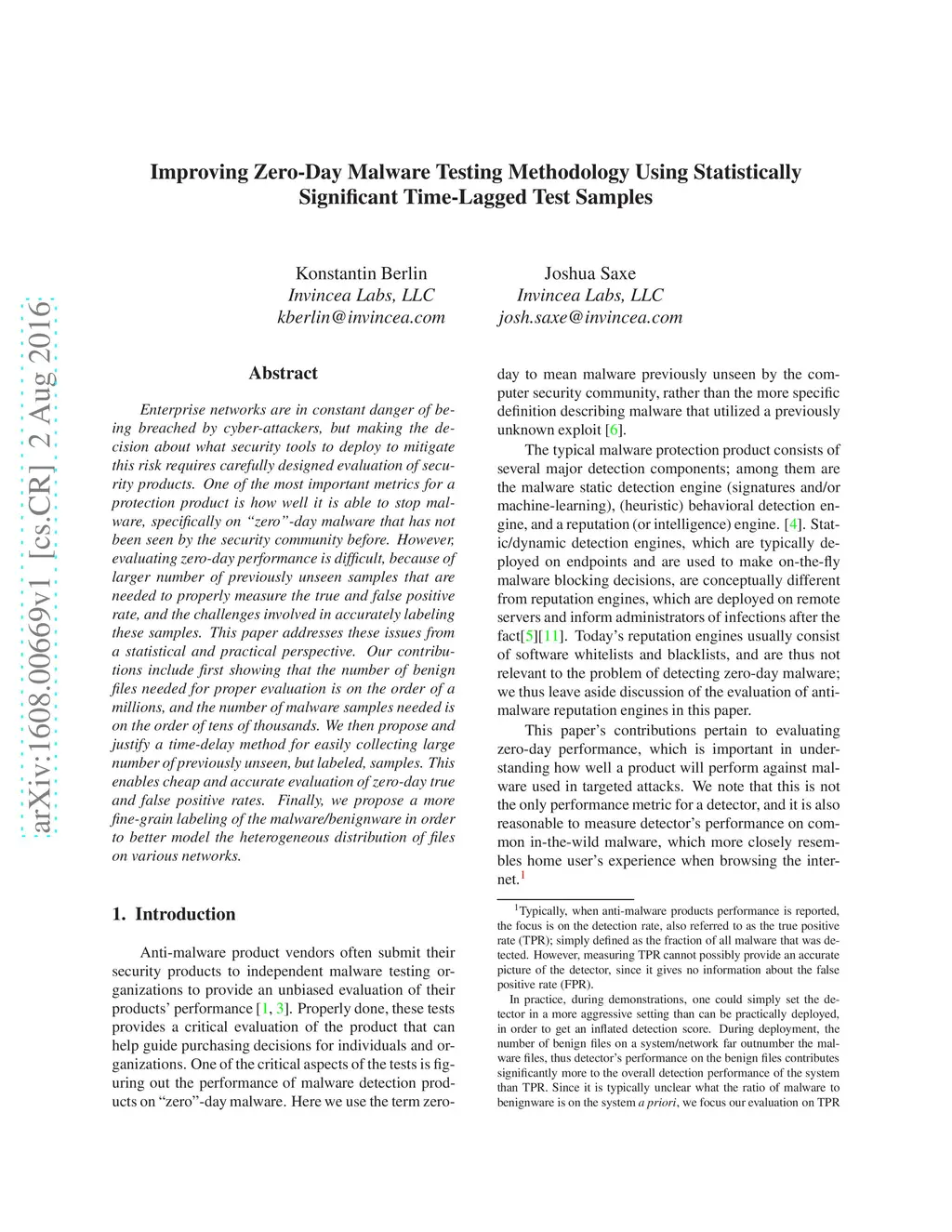 Enterprise networks are in constant danger of being breached by cyber-attackers, but making the decision about what security tools to deploy to mitigate this risk requires carefully designed evaluation of security products. One of the most important metrics for a protection product is how well it is able to stop malware, specifically on "zero"-day malware that has not been seen by the security community before. However, evaluating zero-day performance is difficult, because of larger number of previously unseen samples that are needed to properly measure the true and false positive rate, and the challenges involved in accurately labeling these samples. This paper addresses these issues from a statistical and practical perspective. Our contributions include first showing that the number of benign files needed for proper evaluation is on the order of a millions, and the number of malware samples needed is on the order of tens of thousands. We then propose and justify a time-delay method for easily collecting large number of previously unseen, but labeled, samples. This enables cheap and accurate evaluation of zero-day true and false positive rates. Finally, we propose a more fine-grain labeling of the malware/benignware in order to better model the heterogeneous distribution of files on various networks.