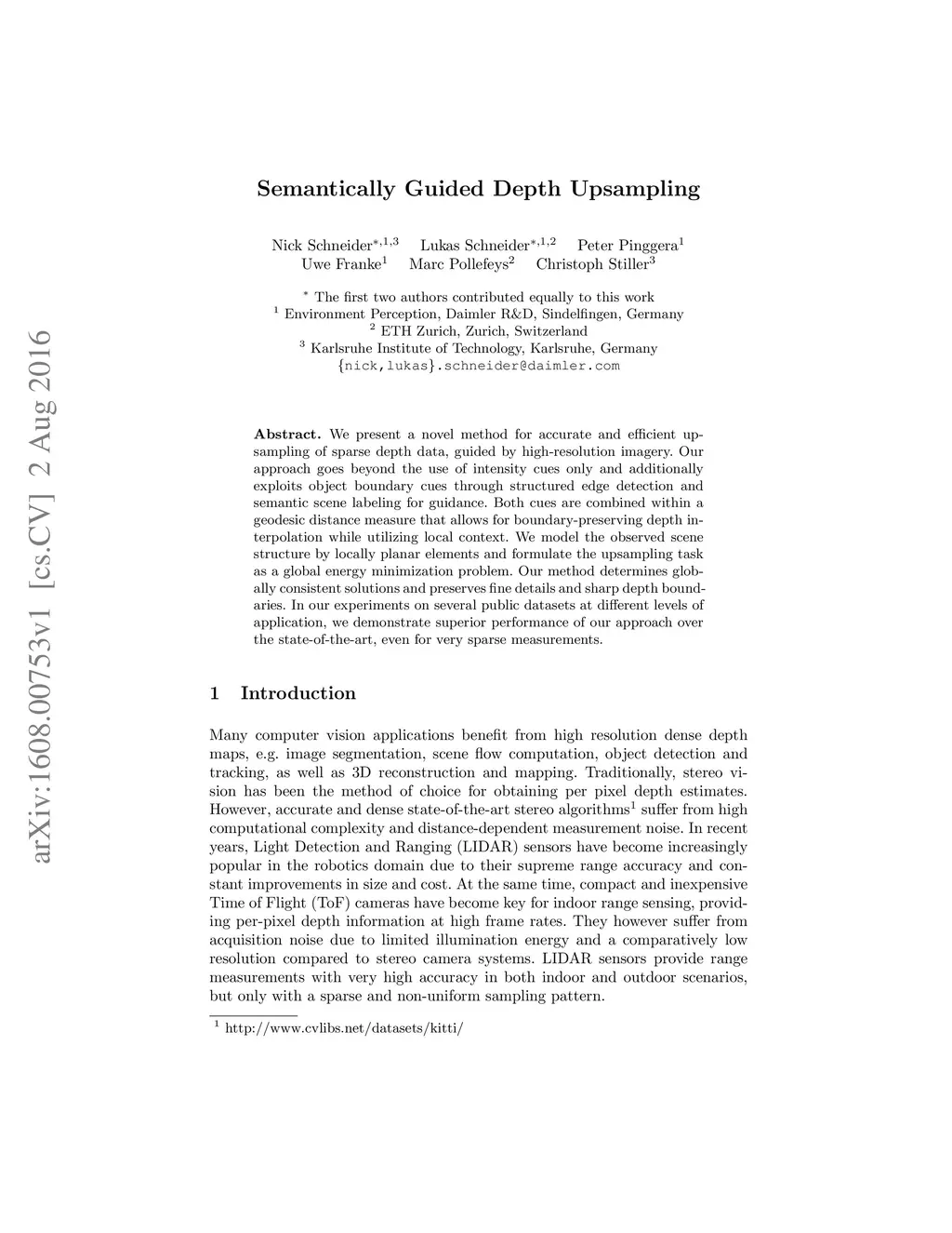 We present a novel method for accurate and efficient up- sampling of sparse depth data, guided by high-resolution imagery. Our approach goes beyond the use of intensity cues only and additionally exploits object boundary cues through structured edge detection and semantic scene labeling for guidance. Both cues are combined within a geodesic distance measure that allows for boundary-preserving depth in- terpolation while utilizing local context. We model the observed scene structure by locally planar elements and formulate the upsampling task as a global energy minimization problem. Our method determines glob- ally consistent solutions and preserves fine details and sharp depth bound- aries. In our experiments on several public datasets at different levels of application, we demonstrate superior performance of our approach over the state-of-the-art, even for very sparse measurements.