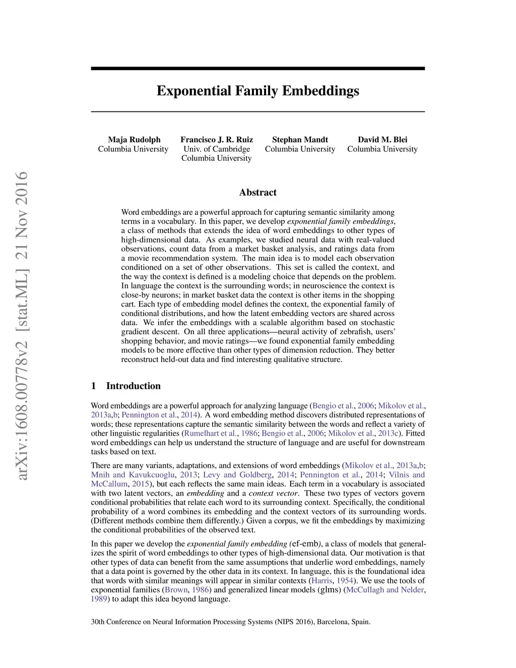 Word embeddings are a powerful approach for capturing semantic similarity among terms in a vocabulary. In this paper, we develop exponential family embeddings, a class of methods that extends the idea of word embeddings to other types of high-dimensional data. As examples, we studied neural data with real-valued observations, count data from a market basket analysis, and ratings data from a movie recommendation system. The main idea is to model each observation conditioned on a set of other observations. This set is called the context, and the way the context is defined is a modeling choice that depends on the problem. In language the context is the surrounding words; in neuroscience the context is close-by neurons; in market basket data the context is other items in the shopping cart. Each type of embedding model defines the context, the exponential family of conditional distributions, and how the latent embedding vectors are shared across data. We infer the embeddings with a scalable algorithm based on stochastic gradient descent. On all three applications - neural activity of zebrafish, users' shopping behavior, and movie ratings - we found exponential family embedding models to be more effective than other types of dimension reduction. They better reconstruct held-out data and find interesting qualitative structure.