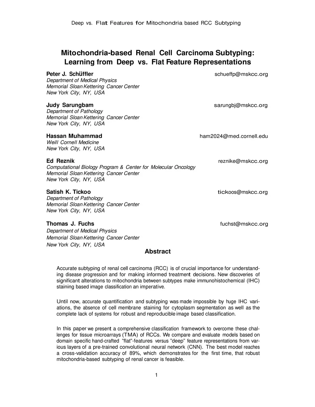 Accurate subtyping of renal cell carcinoma (RCC) is of crucial importance for understanding disease progression and for making informed treatment decisions. New discoveries of significant alterations to mitochondria between subtypes make immunohistochemical (IHC) staining based image classification an imperative. Until now, accurate quantification and subtyping was made impossible by huge IHC variations, the absence of cell membrane staining for cytoplasm segmentation as well as the complete lack of systems for robust and reproducible image based classification. In this paper we present a comprehensive classification framework to overcome these challenges for tissue microarrays (TMA) of RCCs. We compare and evaluate models based on domain specific hand-crafted "flat"-features versus "deep" feature representations from various layers of a pre-trained convolutional neural network (CNN). The best model reaches a cross-validation accuracy of 89%, which demonstrates for the first time, that robust mitochondria-based subtyping of renal cancer is feasible