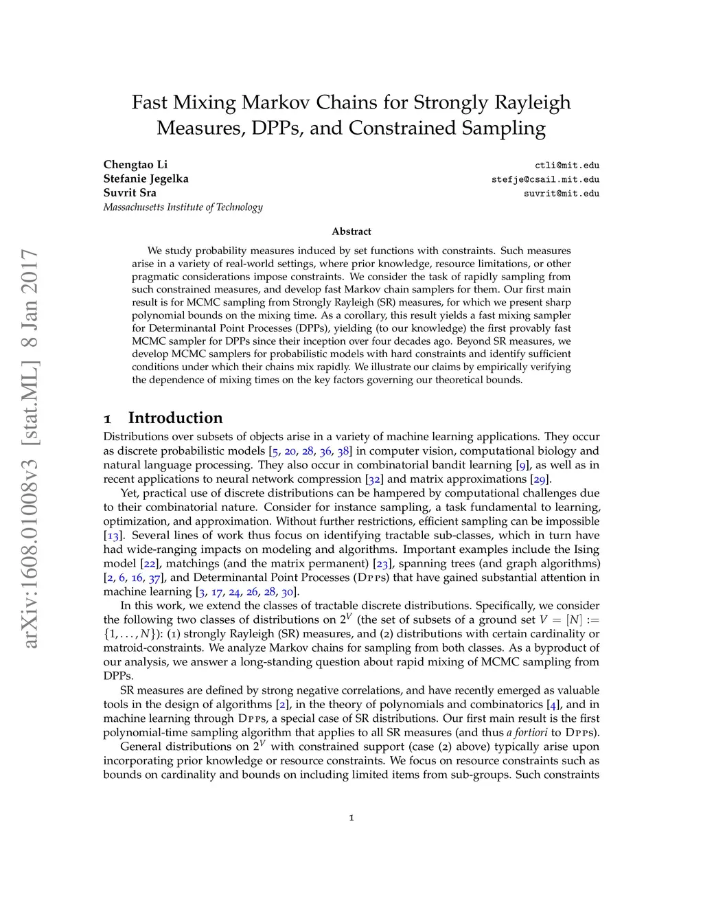 We study probability measures induced by set functions with constraints. Such measures arise in a variety of real-world settings, where prior knowledge, resource limitations, or other pragmatic considerations impose constraints. We consider the task of rapidly sampling from such constrained measures, and develop fast Markov chain samplers for them. Our first main result is for MCMC sampling from Strongly Rayleigh (SR) measures, for which we present sharp polynomial bounds on the mixing time. As a corollary, this result yields a fast mixing sampler for Determinantal Point Processes (DPPs), yielding (to our knowledge) the first provably fast MCMC sampler for DPPs since their inception over four decades ago. Beyond SR measures, we develop MCMC samplers for probabilistic models with hard constraints and identify sufficient conditions under which their chains mix rapidly. We illustrate our claims by empirically verifying the dependence of mixing times on the key factors governing our theoretical bounds.