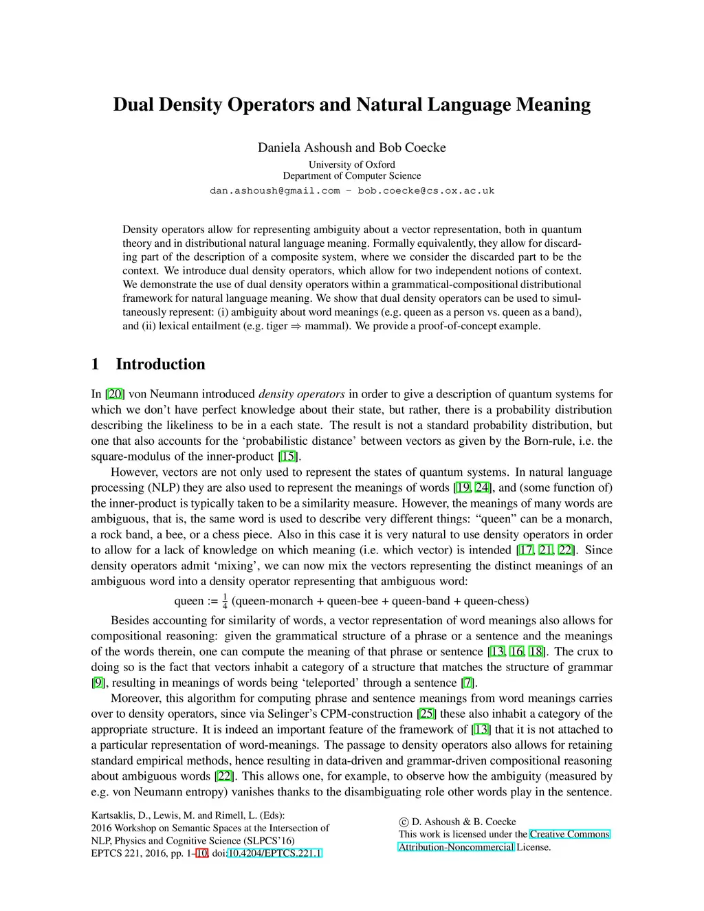 Density operators allow for representing ambiguity about a vector representation, both in quantum theory and in distributional natural language meaning. Formally equivalently, they allow for discarding part of the description of a composite system, where we consider the discarded part to be the context. We introduce dual density operators, which allow for two independent notions of context. We demonstrate the use of dual density operators within a grammatical-compositional distributional framework for natural language meaning. We show that dual density operators can be used to simultaneously represent: (i) ambiguity about word meanings (e.g. queen as a person vs. queen as a band), and (ii) lexical entailment (e.g. tiger -> mammal). We provide a proof-of-concept example.