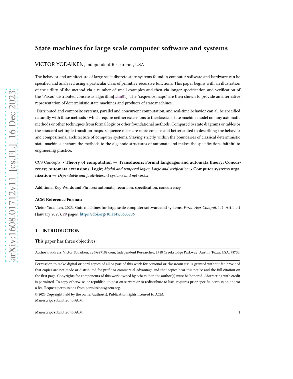 The behavior and architecture of large scale discrete state systems found in computer software and hardware can be specified and analyzed using a particular class of primitive recursive functions. This paper begins with an illustration of the utility of the method via a number of small examples and then via longer specification and verification of the Paxos distributed consensus algorithm. The sequence maps are then shown to provide an alternative representation of deterministic state machines and algebraic products of state machines. Distributed and composite systems, parallel and concurrent computation, and real-time behavior can all be specified naturally with these methods - which require neither extensions to the classical state machine model nor any axiomatic methods or other techniques from formal methods. Compared to state diagrams or tables or the standard set-tuple-transition-maps, sequence maps are more concise and better suited to describing the behavior and compositional architecture of computer systems. Staying strictly within the boundaries of classical deterministic state machines anchors the methods to the algebraic structures of automata and makes the specifications faithful to engineering practice.