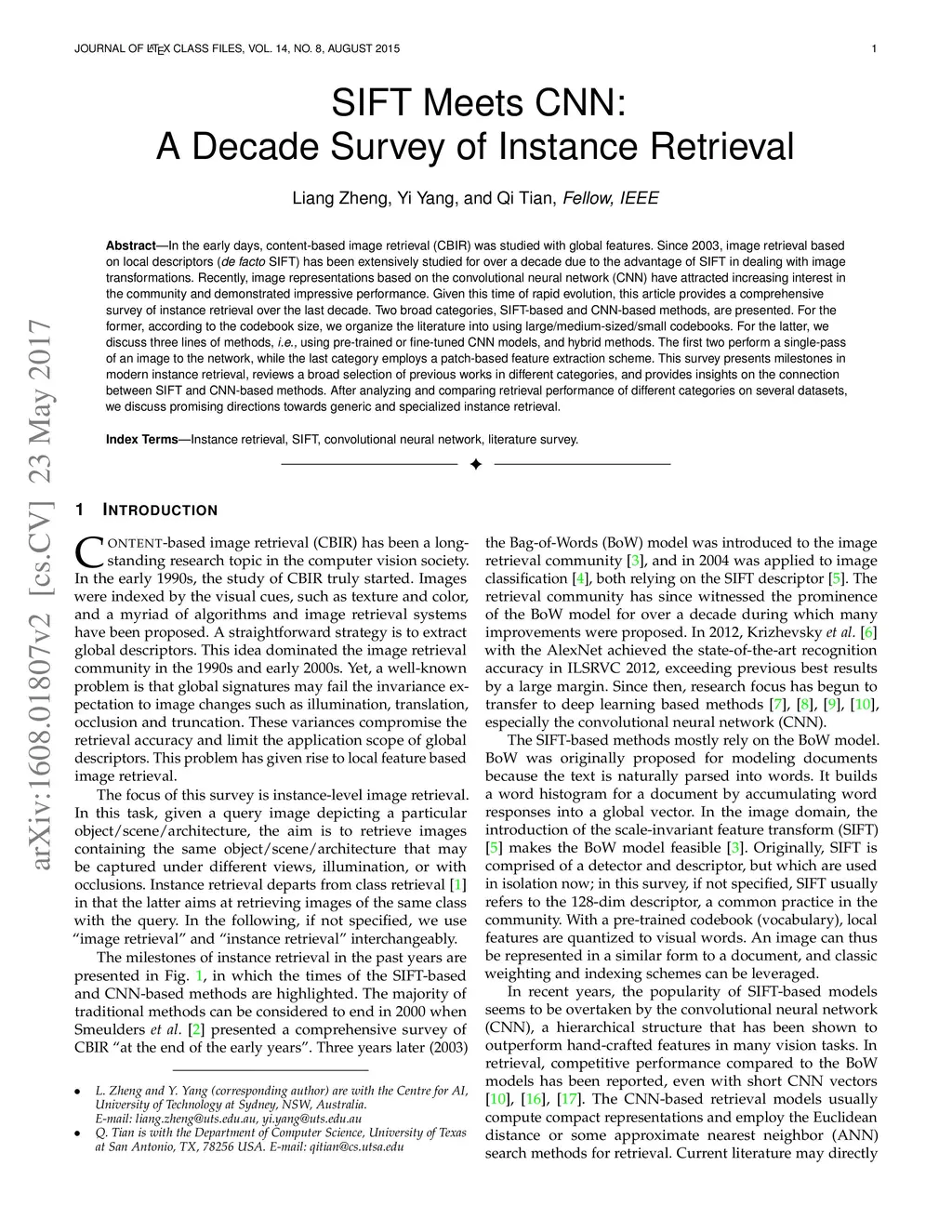 In the early days, content-based image retrieval (CBIR) was studied with global features. Since 2003, image retrieval based on local descriptors (de facto SIFT) has been extensively studied for over a decade due to the advantage of SIFT in dealing with image transformations. Recently, image representations based on the convolutional neural network (CNN) have attracted increasing interest in the community and demonstrated impressive performance. Given this time of rapid evolution, this article provides a comprehensive survey of instance retrieval over the last decade. Two broad categories, SIFT-based and CNN-based methods, are presented. For the former, according to the codebook size, we organize the literature into using large/medium-sized/small codebooks. For the latter, we discuss three lines of methods, i.e., using pre-trained or fine-tuned CNN models, and hybrid methods. The first two perform a single-pass of an image to the network, while the last category employs a patch-based feature extraction scheme. This survey presents milestones in modern instance retrieval, reviews a broad selection of previous works in different categories, and provides insights on the connection between SIFT and CNN-based methods. After analyzing and comparing retrieval performance of different categories on several datasets, we discuss promising directions towards generic and specialized instance retrieval.