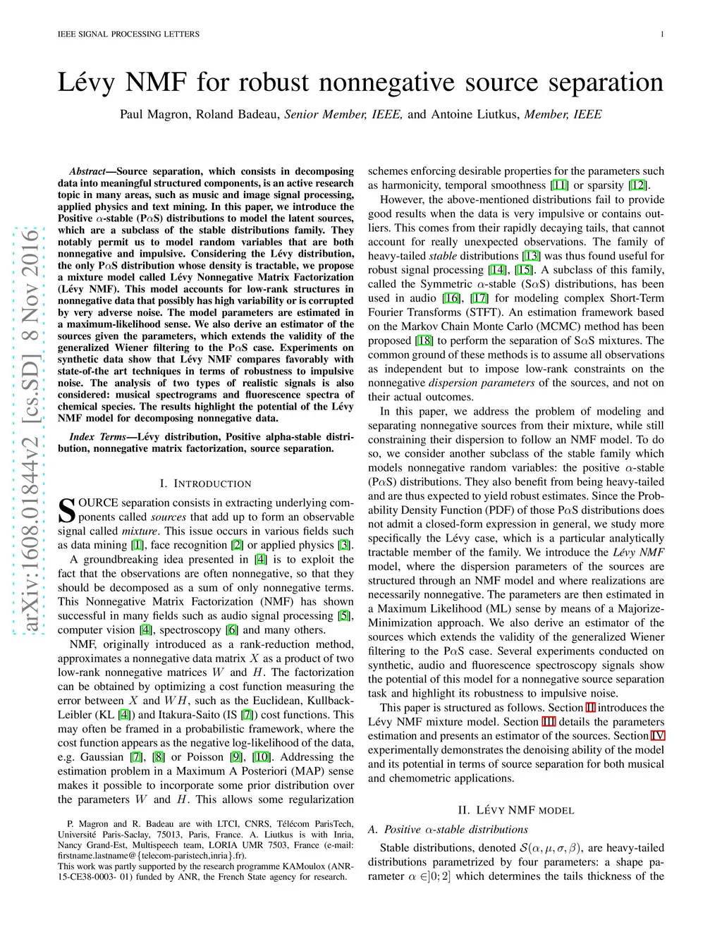 Source separation, which consists in decomposing data into meaningful structured components, is an active research topic in many areas, such as music and image signal processing, applied physics and text mining. In this paper, we introduce the Positive -stable (PS) distributions to model the latent sources, which are a subclass of the stable distributions family. They notably permit us to model random variables that are both nonnegative and impulsive. Considering the L\évy distribution, the only PS distribution whose density is tractable, we propose a mixture model called L\évy Nonnegative Matrix Factorization (L\évy NMF). This model accounts for low-rank structures in nonnegative data that possibly has high variability or is corrupted by very adverse noise. The model parameters are estimated in a maximum-likelihood sense. We also derive an estimator of the sources given the parameters, which extends the validity of the generalized Wiener filtering to the PS case. Experiments on synthetic data show that L\évy NMF compares favorably with state-of-the art techniques in terms of robustness to impulsive noise. The analysis of two types of realistic signals is also considered: musical spectrograms and fluorescence spectra of chemical species. The results highlight the potential of the L\évy NMF model for decomposing nonnegative data.