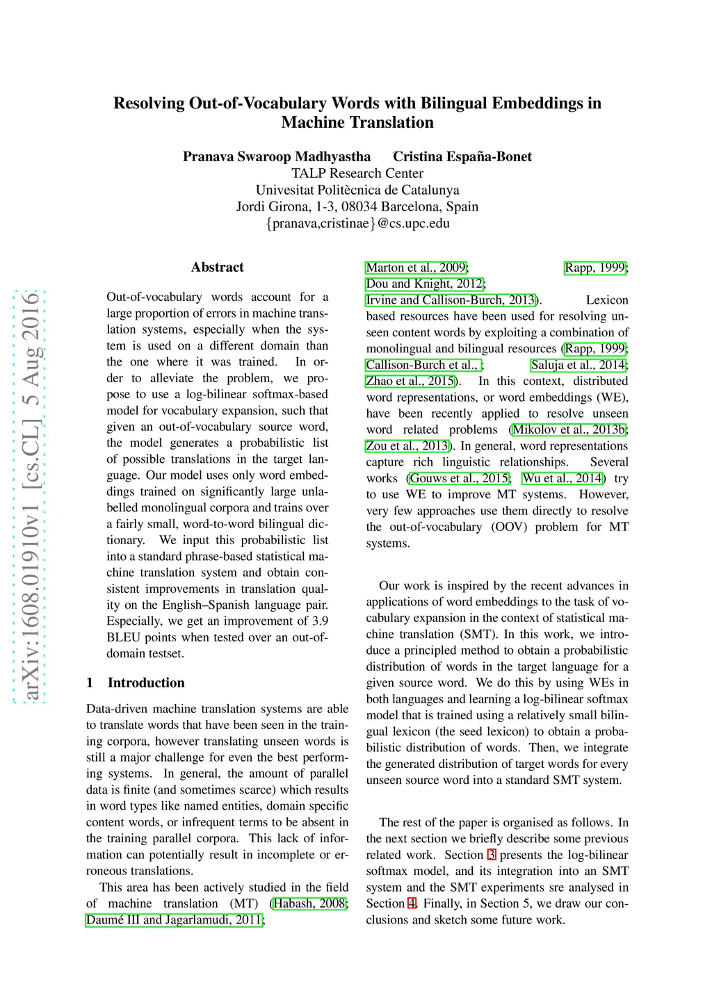 Resolving Out-of-Vocabulary Words with Bilingual Embeddings in Machine