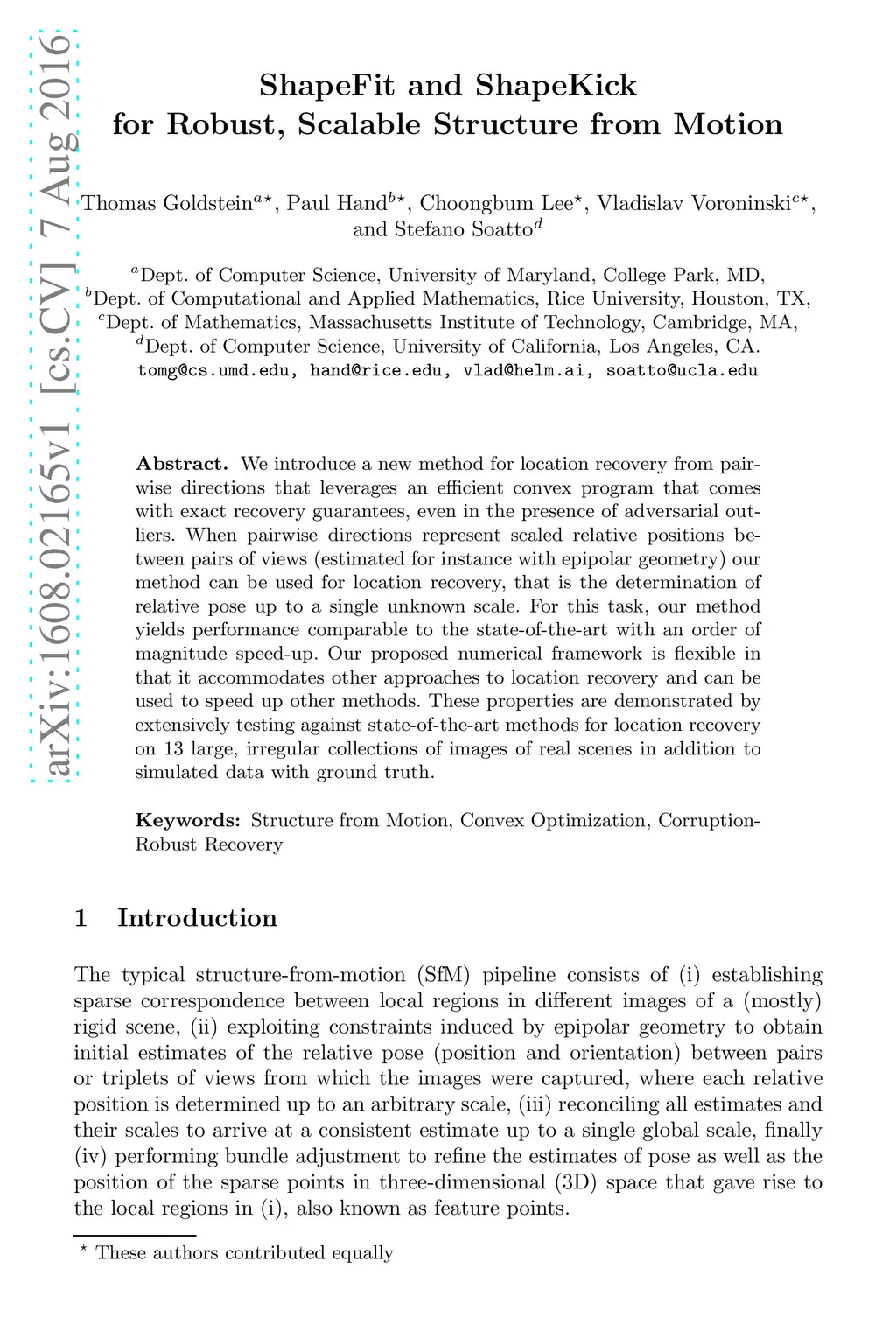 We introduce a new method for location recovery from pair-wise directions that leverages an efficient convex program that comes with exact recovery guarantees, even in the presence of adversarial outliers. When pairwise directions represent scaled relative positions between pairs of views (estimated for instance with epipolar geometry) our method can be used for location recovery, that is the determination of relative pose up to a single unknown scale. For this task, our method yields performance comparable to the state-of-the-art with an order of magnitude speed-up. Our proposed numerical framework is flexible in that it accommodates other approaches to location recovery and can be used to speed up other methods. These properties are demonstrated by extensively testing against state-of-the-art methods for location recovery on 13 large, irregular collections of images of real scenes in addition to simulated data with ground truth.