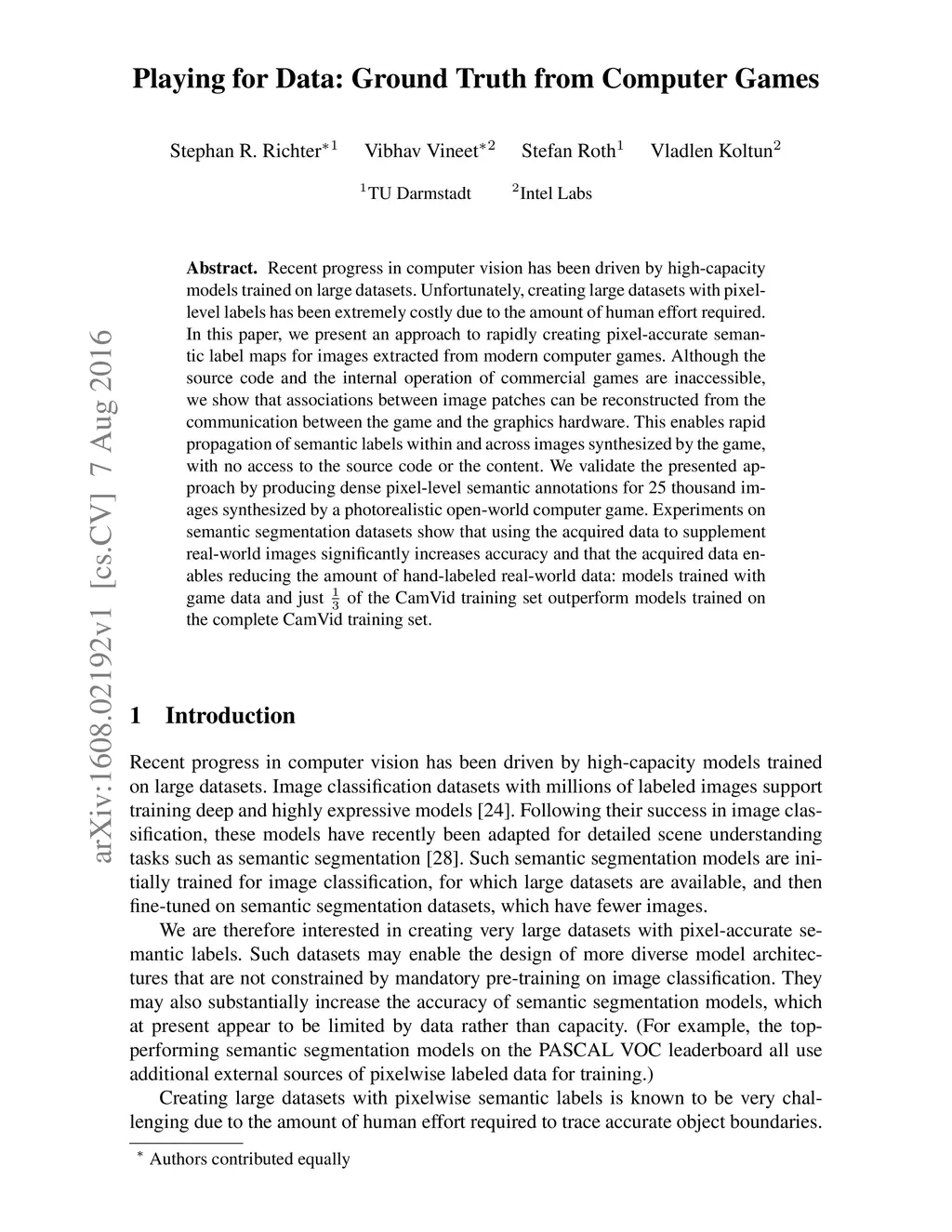 Recent progress in computer vision has been driven by high-capacity models trained on large datasets. Unfortunately, creating large datasets with pixel-level labels has been extremely costly due to the amount of human effort required. In this paper, we present an approach to rapidly creating pixel-accurate semantic label maps for images extracted from modern computer games. Although the source code and the internal operation of commercial games are inaccessible, we show that associations between image patches can be reconstructed from the communication between the game and the graphics hardware. This enables rapid propagation of semantic labels within and across images synthesized by the game, with no access to the source code or the content. We validate the presented approach by producing dense pixel-level semantic annotations for 25 thousand images synthesized by a photorealistic open-world computer game. Experiments on semantic segmentation datasets show that using the acquired data to supplement real-world images significantly increases accuracy and that the acquired data enables reducing the amount of hand-labeled real-world data: models trained with game data and just 1/3 of the CamVid training set outperform models trained on the complete CamVid training set.