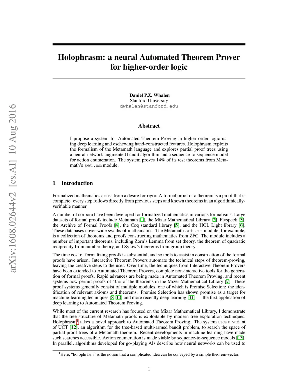 I propose a system for Automated Theorem Proving in higher order logic using deep learning and eschewing hand-constructed features. Holophrasm exploits the formalism of the Metamath language and explores partial proof trees using a neural-network-augmented bandit algorithm and a sequence-to-sequence model for action enumeration. The system proves 14% of its test theorems from Metamath's set.mm module.