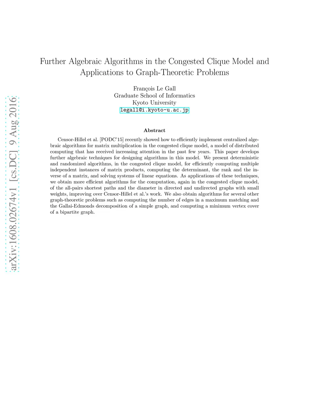 Censor-Hillel et al. [PODC'15] recently showed how to efficiently implement centralized algebraic algorithms for matrix multiplication in the congested clique model, a model of distributed computing that has received increasing attention in the past few years. This paper develops further algebraic techniques for designing algorithms in this model. We present deterministic and randomized algorithms, in the congested clique model, for efficiently computing multiple independent instances of matrix products, computing the determinant, the rank and the inverse of a matrix, and solving systems of linear equations. As applications of these techniques, we obtain more efficient algorithms for the computation, again in the congested clique model, of the all-pairs shortest paths and the diameter in directed and undirected graphs with small weights, improving over Censor-Hillel et al.'s work. We also obtain algorithms for several other graph-theoretic problems such as computing the number of edges in a maximum matching and the Gallai-Edmonds decomposition of a simple graph, and computing a minimum vertex cover of a bipartite graph.