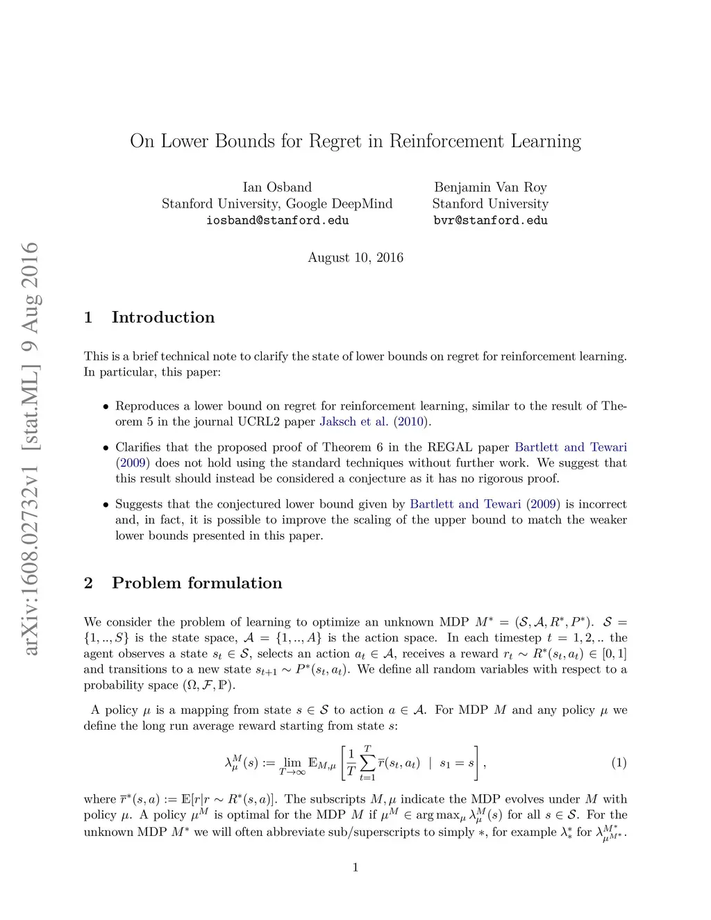 This is a brief technical note to clarify the state of lower bounds on regret for reinforcement learning. In particular, this paper: - Reproduces a lower bound on regret for reinforcement learning, similar to the result of Theorem 5 in the journal UCRL2 paper (Jaksch et al 2010). - Clarifies that the proposed proof of Theorem 6 in the REGAL paper (Bartlett and Tewari 2009) does not hold using the standard techniques without further work. We suggest that this result should instead be considered a conjecture as it has no rigorous proof. - Suggests that the conjectured lower bound given by (Bartlett and Tewari 2009) is incorrect and, in fact, it is possible to improve the scaling of the upper bound to match the weaker lower bounds presented in this paper. We hope that this note serves to clarify existing results in the field of reinforcement learning and provides interesting motivation for future work.