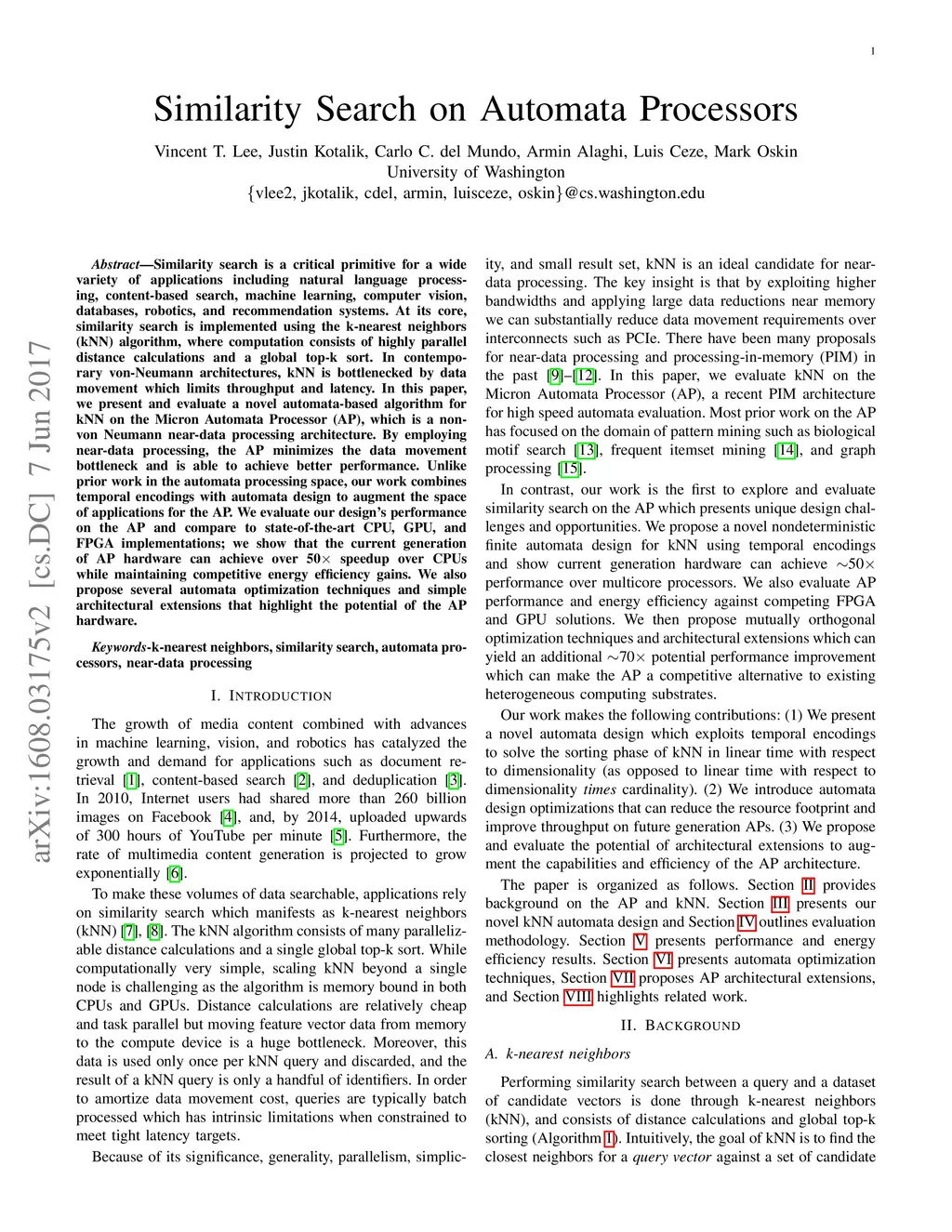 Similarity search is a critical primitive for a wide variety of applications including natural language processing, content-based search, machine learning, computer vision, databases, robotics, and recommendation systems. At its core, similarity search is implemented using the k-nearest neighbors (kNN) algorithm, where computation consists of highly parallel distance calculations and a global top-k sort. In contemporary von-Neumann architectures, kNN is bottlenecked by data movement which limits throughput and latency. In this paper, we present and evaluate a novel automata-based algorithm for kNN on the Micron Automata Processor (AP), which is a non-von Neumann near-data processing architecture. By employing near-data processing, the AP minimizes the data movement bottleneck and is able to achieve better performance. Unlike prior work in the automata processing space, our work combines temporal encodings with automata design to augment the space of applications for the AP. We evaluate our design's performance on the AP and compare to state-of-the-art CPU, GPU, and FPGA implementations; we show that the current generation of AP hardware can achieve over 50x speedup over CPUs while maintaining competitive energy efficiency gains. We also propose several automata optimization techniques and simple architectural extensions that highlight the potential of the AP hardware.