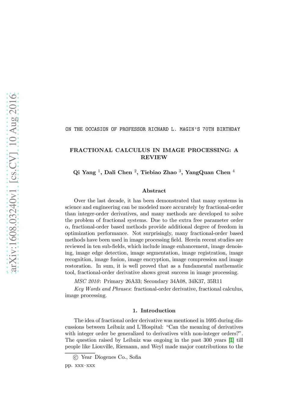 Over the last decade, it has been demonstrated that many systems in science and engineering can be modeled more accurately by fractional-order than integer-order derivatives, and many methods are developed to solve the problem of fractional systems. Due to the extra free parameter order, fractional-order based methods provide additional degree of freedom in optimization performance. Not surprisingly, many fractional-order based methods have been used in image processing field. Herein recent studies are reviewed in ten sub-fields, which include image enhancement, image denoising, image edge detection, image segmentation, image registration, image recognition, image fusion, image encryption, image compression and image restoration. In sum, it is well proved that as a fundamental mathematic tool, fractional-order derivative shows great success in image processing.