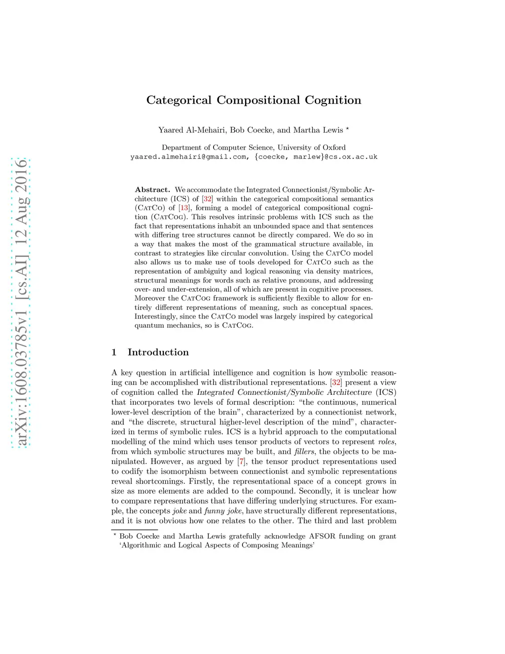 We accommodate the Integrated Connectionist/Symbolic Architecture (ICS) of [32] within the categorical compositional semantics (CatCo) of [13], forming a model of categorical compositional cognition (CatCog). This resolves intrinsic problems with ICS such as the fact that representations inhabit an unbounded space and that sentences with differing tree structures cannot be directly compared. We do so in a way that makes the most of the grammatical structure available, in contrast to strategies like circular convolution. Using the CatCo model also allows us to make use of tools developed for CatCo such as the representation of ambiguity and logical reasoning via density matrices, structural meanings for words such as relative pronouns, and addressing over- and under-extension, all of which are present in cognitive processes. Moreover the CatCog framework is sufficiently flexible to allow for entirely different representations of meaning, such as conceptual spaces. Interestingly, since the CatCo model was largely inspired by categorical quantum mechanics, so is CatCog.