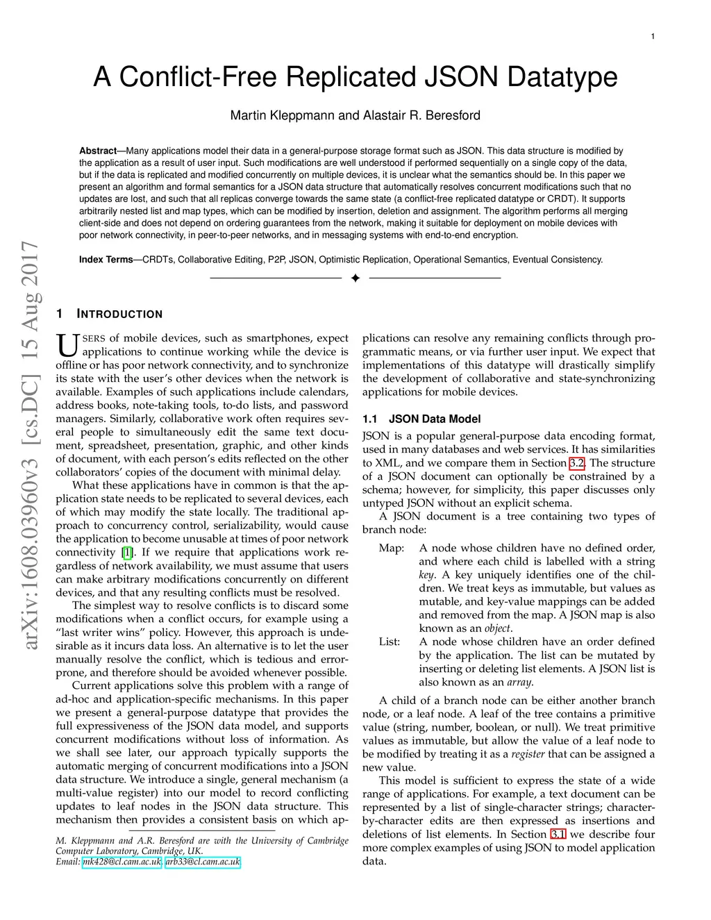 Many applications model their data in a general-purpose storage format such as JSON. This data structure is modified by the application as a result of user input. Such modifications are well understood if performed sequentially on a single copy of the data, but if the data is replicated and modified concurrently on multiple devices, it is unclear what the semantics should be. In this paper we present an algorithm and formal semantics for a JSON data structure that automatically resolves concurrent modifications such that no updates are lost, and such that all replicas converge towards the same state (a conflict-free replicated datatype or CRDT). It supports arbitrarily nested list and map types, which can be modified by insertion, deletion and assignment. The algorithm performs all merging client-side and does not depend on ordering guarantees from the network, making it suitable for deployment on mobile devices with poor network connectivity, in peer-to-peer networks, and in messaging systems with end-to-end encryption.