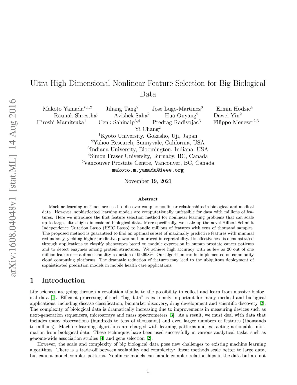 Machine learning methods are used to discover complex nonlinear relationships in biological and medical data. However, sophisticated learning models are computationally unfeasible for data with millions of features. Here we introduce the first feature selection method for nonlinear learning problems that can scale up to large, ultra-high dimensional biological data. More specifically, we scale up the novel Hilbert-Schmidt Independence Criterion Lasso (HSIC Lasso) to handle millions of features with tens of thousand samples. The proposed method is guaranteed to find an optimal subset of maximally predictive features with minimal redundancy, yielding higher predictive power and improved interpretability. Its effectiveness is demonstrated through applications to classify phenotypes based on module expression in human prostate cancer patients and to detect enzymes among protein structures. We achieve high accuracy with as few as 20 out of one million features --- a dimensionality reduction of 99.998%. Our algorithm can be implemented on commodity cloud computing platforms. The dramatic reduction of features may lead to the ubiquitous deployment of sophisticated prediction models in mobile health care applications.