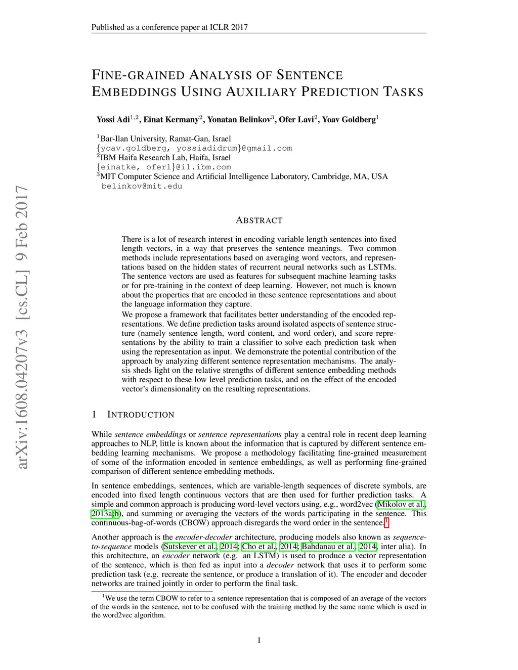 Fine-grained Analysis of Sentence Embeddings Using Auxiliary Prediction Tasks