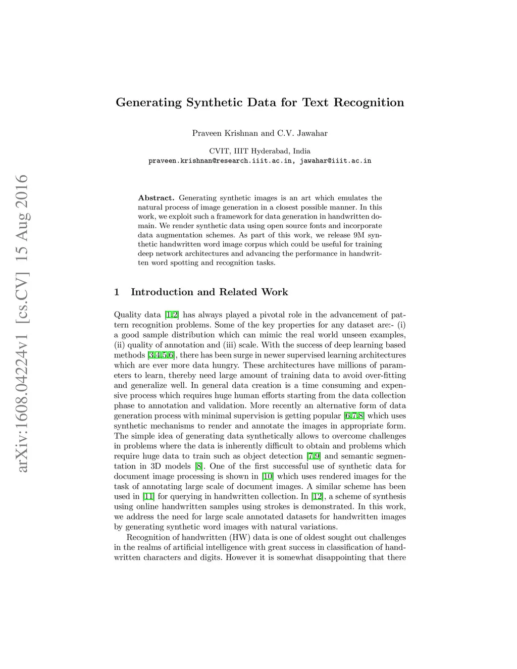 Generating synthetic images is an art which emulates the natural process of image generation in a closest possible manner. In this work, we exploit such a framework for data generation in handwritten domain. We render synthetic data using open source fonts and incorporate data augmentation schemes. As part of this work, we release 9M synthetic handwritten word image corpus which could be useful for training deep network architectures and advancing the performance in handwritten word spotting and recognition tasks.