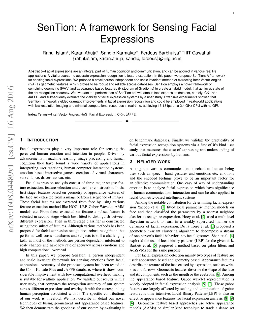 Facial expressions are an integral part of human cognition and communication, and can be applied in various real life applications. A vital precursor to accurate expression recognition is feature extraction. In this paper, we propose SenTion: A framework for sensing facial expressions. We propose a novel person independent and scale invariant method of extracting Inter Vector Angles (IVA) as geometric features, which proves to be robust and reliable across databases. SenTion employs a novel framework of combining geometric (IVA's) and appearance based features (Histogram of Gradients) to create a hybrid model, that achieves state of the art recognition accuracy. We evaluate the performance of SenTion on two famous face expression data set, namely: CK+ and JAFFE; and subsequently evaluate the viability of facial expression systems by a user study. Extensive experiments showed that SenTion framework yielded dramatic improvements in facial expression recognition and could be employed in real-world applications with low resolution imaging and minimal computational resources in real-time, achieving 15-18 fps on a 2.4 GHz CPU with no GPU.