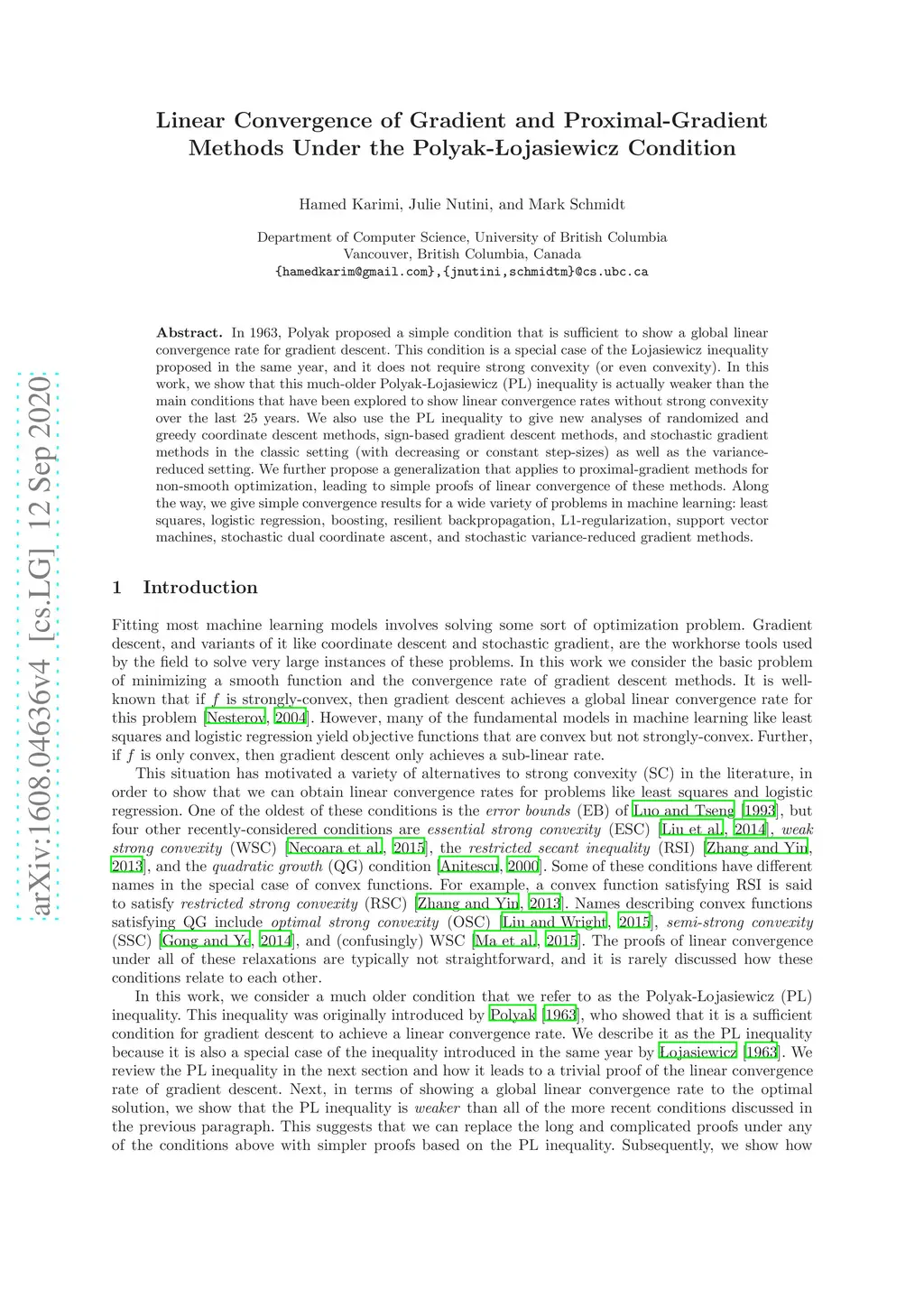 In 1963, Polyak proposed a simple condition that is sufficient to show a global linear convergence rate for gradient descent. This condition is a special case of the \L{}ojasiewicz inequality proposed in the same year, and it does not require strong convexity (or even convexity). In this work, we show that this much-older Polyak-\L{}ojasiewicz (PL) inequality is actually weaker than the main conditions that have been explored to show linear convergence rates without strong convexity over the last 25 years. We also use the PL inequality to give new analyses of randomized and greedy coordinate descent methods, sign-based gradient descent methods, and stochastic gradient methods in the classic setting (with decreasing or constant step-sizes) as well as the variance-reduced setting. We further propose a generalization that applies to proximal-gradient methods for non-smooth optimization, leading to simple proofs of linear convergence of these methods. Along the way, we give simple convergence results for a wide variety of problems in machine learning: least squares, logistic regression, boosting, resilient backpropagation, L1-regularization, support vector machines, stochastic dual coordinate ascent, and stochastic variance-reduced gradient methods.