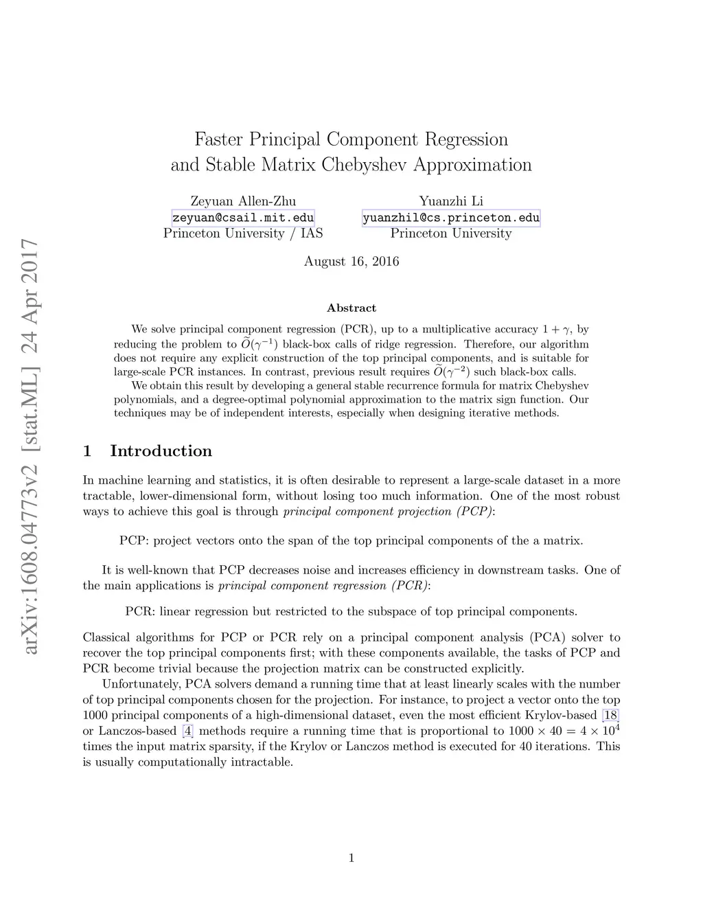 We solve principal component regression (PCR), up to a multiplicative accuracy , by reducing the problem to black-box calls of ridge regression. Therefore, our algorithm does not require any explicit construction of the top principal components, and is suitable for large-scale PCR instances. In contrast, previous result requires such black-box calls. We obtain this result by developing a general stable recurrence formula for matrix Chebyshev polynomials, and a degree-optimal polynomial approximation to the matrix sign function. Our techniques may be of independent interests, especially when designing iterative methods.
