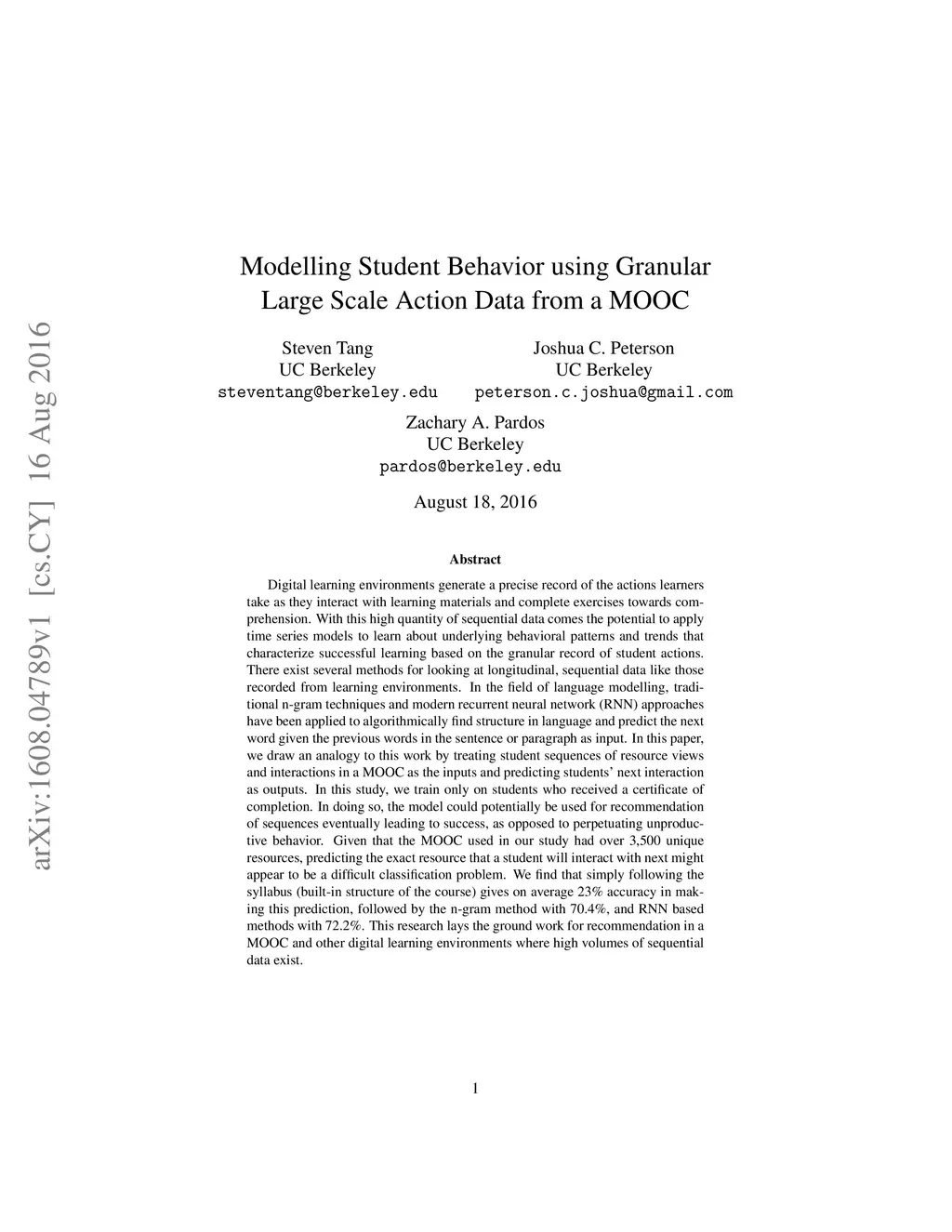 Modelling Student Behavior using Granular Large Scale Action Data from a