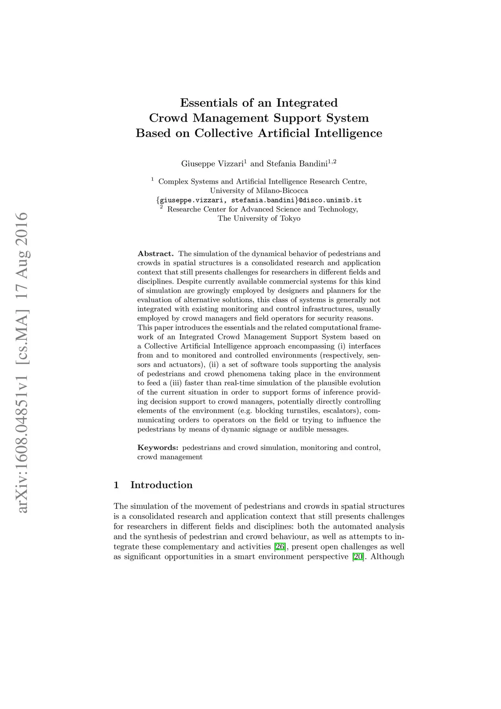 The simulation of the dynamical behavior of pedestrians and crowds in spatial structures is a consolidated research and application context that still presents challenges for researchers in different fields and disciplines. Despite currently available commercial systems for this kind of simulation are growingly employed by designers and planners for the evaluation of alternative solutions, this class of systems is generally not integrated with existing monitoring and control infrastructures, usually employed by crowd managers and field operators for security reasons. This paper introduces the essentials and the related computational frame- work of an Integrated Crowd Management Support System based on a Collective Artificial Intelligence approach encompassing (i) interfaces from and to monitored and controlled environments (respectively, sen- sors and actuators), (ii) a set of software tools supporting the analysis of pedestrians and crowd phenomena taking place in the environment to feed a (iii) faster than real-time simulation of the plausible evolution of the current situation in order to support forms of inference provid- ing decision support to crowd managers, potentially directly controlling elements of the environment (e.g. blocking turnstiles, escalators), com- municating orders to operators on the field or trying to influence the pedestrians by means of dynamic signage or audible messages.