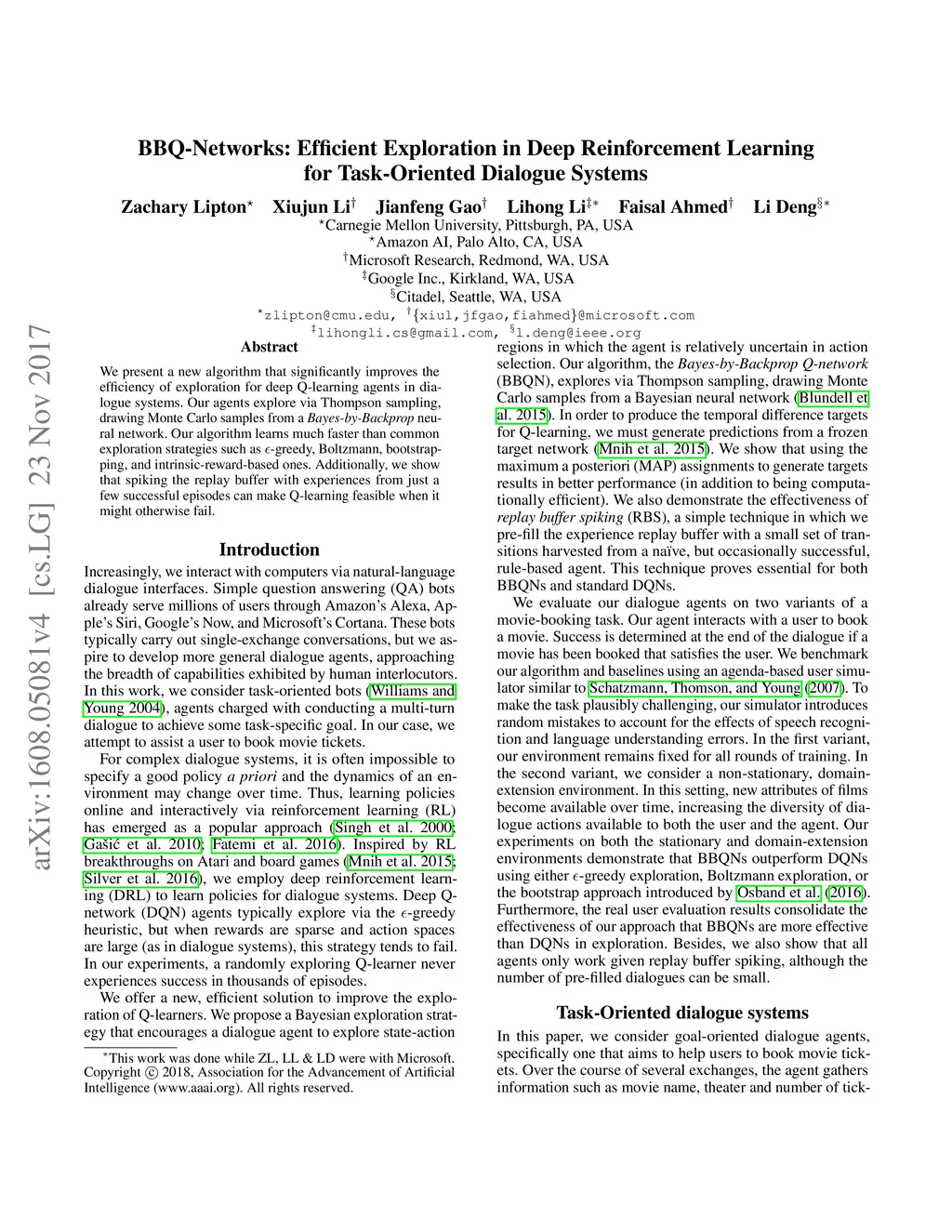 We present a new algorithm that significantly improves the efficiency of exploration for deep Q-learning agents in dialogue systems. Our agents explore via Thompson sampling, drawing Monte Carlo samples from a Bayes-by-Backprop neural network. Our algorithm learns much faster than common exploration strategies such as -greedy, Boltzmann, bootstrapping, and intrinsic-reward-based ones. Additionally, we show that spiking the replay buffer with experiences from just a few successful episodes can make Q-learning feasible when it might otherwise fail.