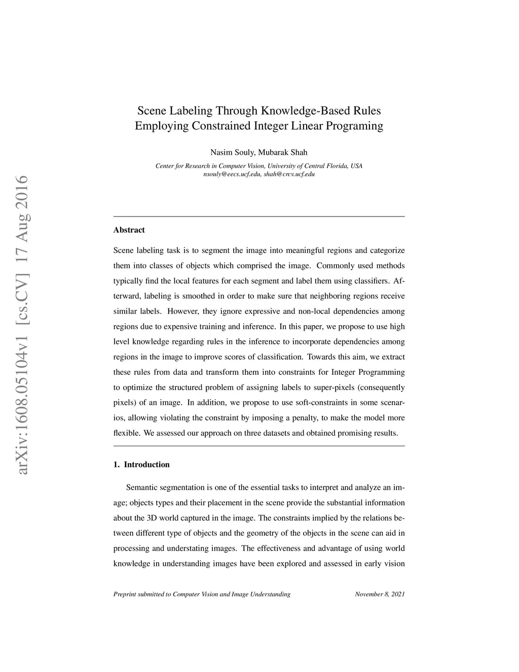 Scene labeling task is to segment the image into meaningful regions and categorize them into classes of objects which comprised the image. Commonly used methods typically find the local features for each segment and label them using classifiers. Afterward, labeling is smoothed in order to make sure that neighboring regions receive similar labels. However, they ignore expressive and non-local dependencies among regions due to expensive training and inference. In this paper, we propose to use high-level knowledge regarding rules in the inference to incorporate dependencies among regions in the image to improve scores of classification. Towards this aim, we extract these rules from data and transform them into constraints for Integer Programming to optimize the structured problem of assigning labels to super-pixels (consequently pixels) of an image. In addition, we propose to use soft-constraints in some scenarios, allowing violating the constraint by imposing a penalty, to make the model more flexible. We assessed our approach on three datasets and obtained promising results.