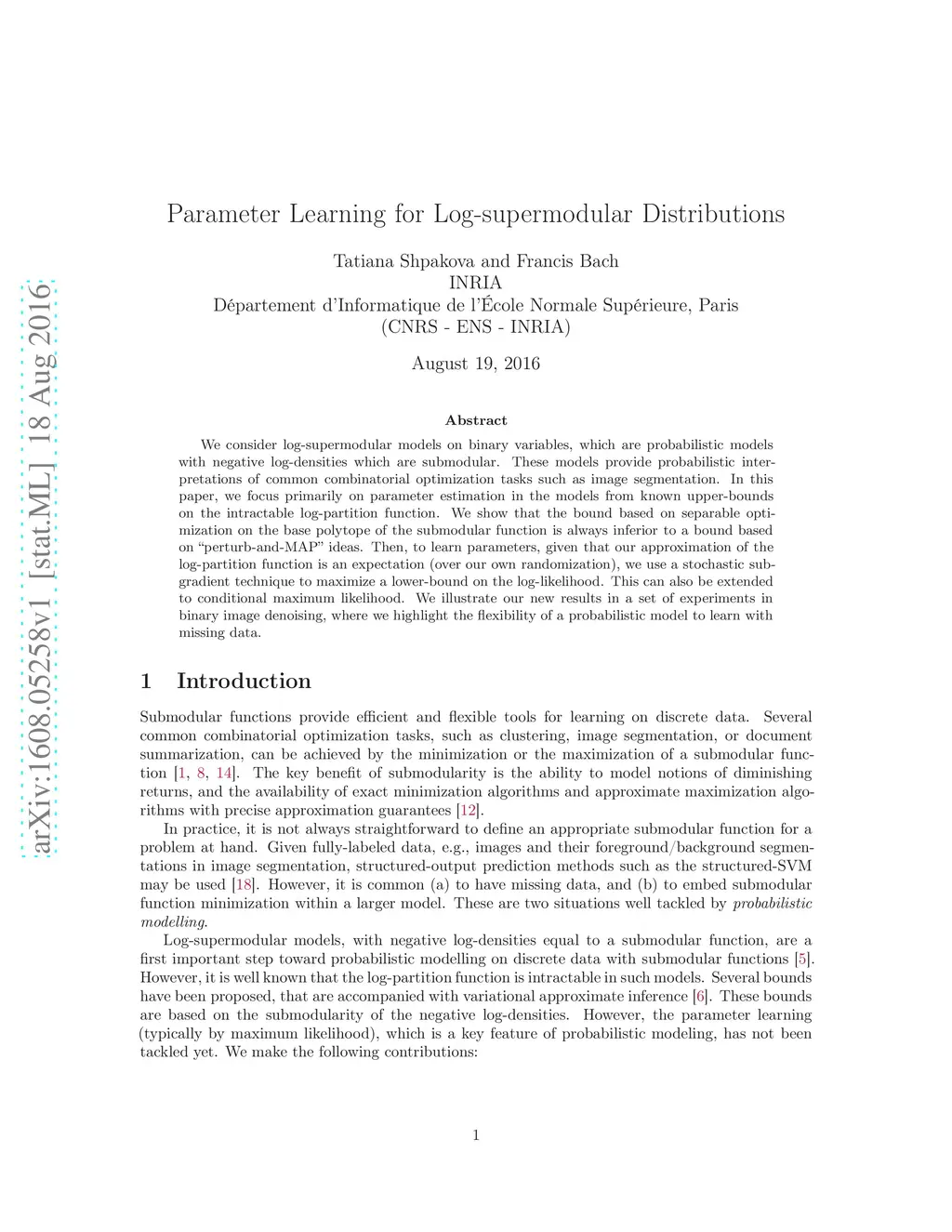 We consider log-supermodular models on binary variables, which are probabilistic models with negative log-densities which are submodular. These models provide probabilistic interpretations of common combinatorial optimization tasks such as image segmentation. In this paper, we focus primarily on parameter estimation in the models from known upper-bounds on the intractable log-partition function. We show that the bound based on separable optimization on the base polytope of the submodular function is always inferior to a bound based on "perturb-and-MAP" ideas. Then, to learn parameters, given that our approximation of the log-partition function is an expectation (over our own randomization), we use a stochastic subgradient technique to maximize a lower-bound on the log-likelihood. This can also be extended to conditional maximum likelihood. We illustrate our new results in a set of experiments in binary image denoising, where we highlight the flexibility of a probabilistic model to learn with missing data.