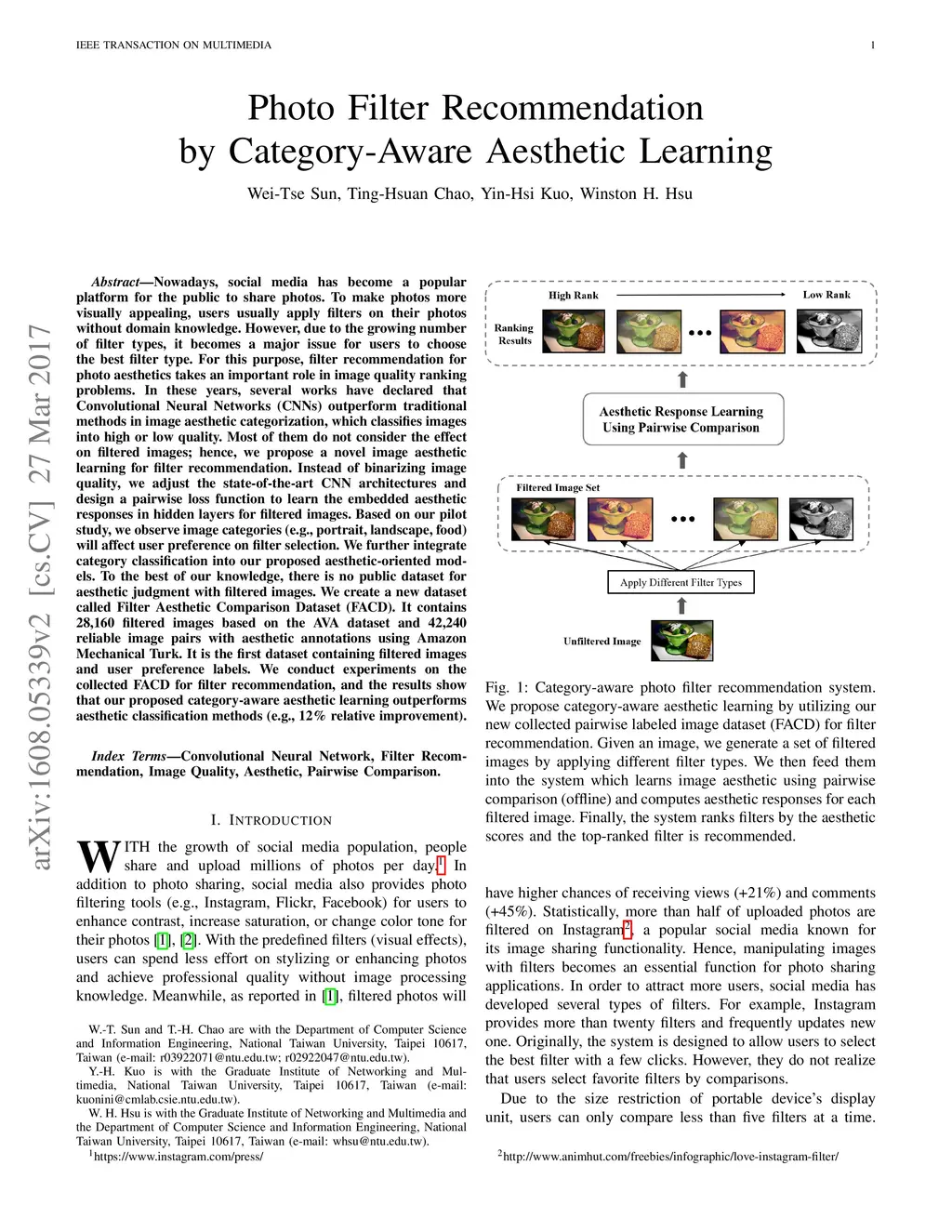 Nowadays, social media has become a popular platform for the public to share photos. To make photos more visually appealing, users usually apply filters on their photos without domain knowledge. However, due to the growing number of filter types, it becomes a major issue for users to choose the best filter type. For this purpose, filter recommendation for photo aesthetics takes an important role in image quality ranking problems. In these years, several works have declared that Convolutional Neural Networks (CNNs) outperform traditional methods in image aesthetic categorization, which classifies images into high or low quality. Most of them do not consider the effect on filtered images; hence, we propose a novel image aesthetic learning for filter recommendation. Instead of binarizing image quality, we adjust the state-of-the-art CNN architectures and design a pairwise loss function to learn the embedded aesthetic responses in hidden layers for filtered images. Based on our pilot study, we observe image categories (e.g., portrait, landscape, food) will affect user preference on filter selection. We further integrate category classification into our proposed aesthetic-oriented models. To the best of our knowledge, there is no public dataset for aesthetic judgment with filtered images. We create a new dataset called Filter Aesthetic Comparison Dataset (FACD). It contains 28,160 filtered images based on the AVA dataset and 42,240 reliable image pairs with aesthetic annotations using Amazon Mechanical Turk. It is the first dataset containing filtered images and user preference labels. We conduct experiments on the collected FACD for filter recommendation, and the results show that our proposed category-aware aesthetic learning outperforms aesthetic classification methods (e.g., 12% relative improvement).