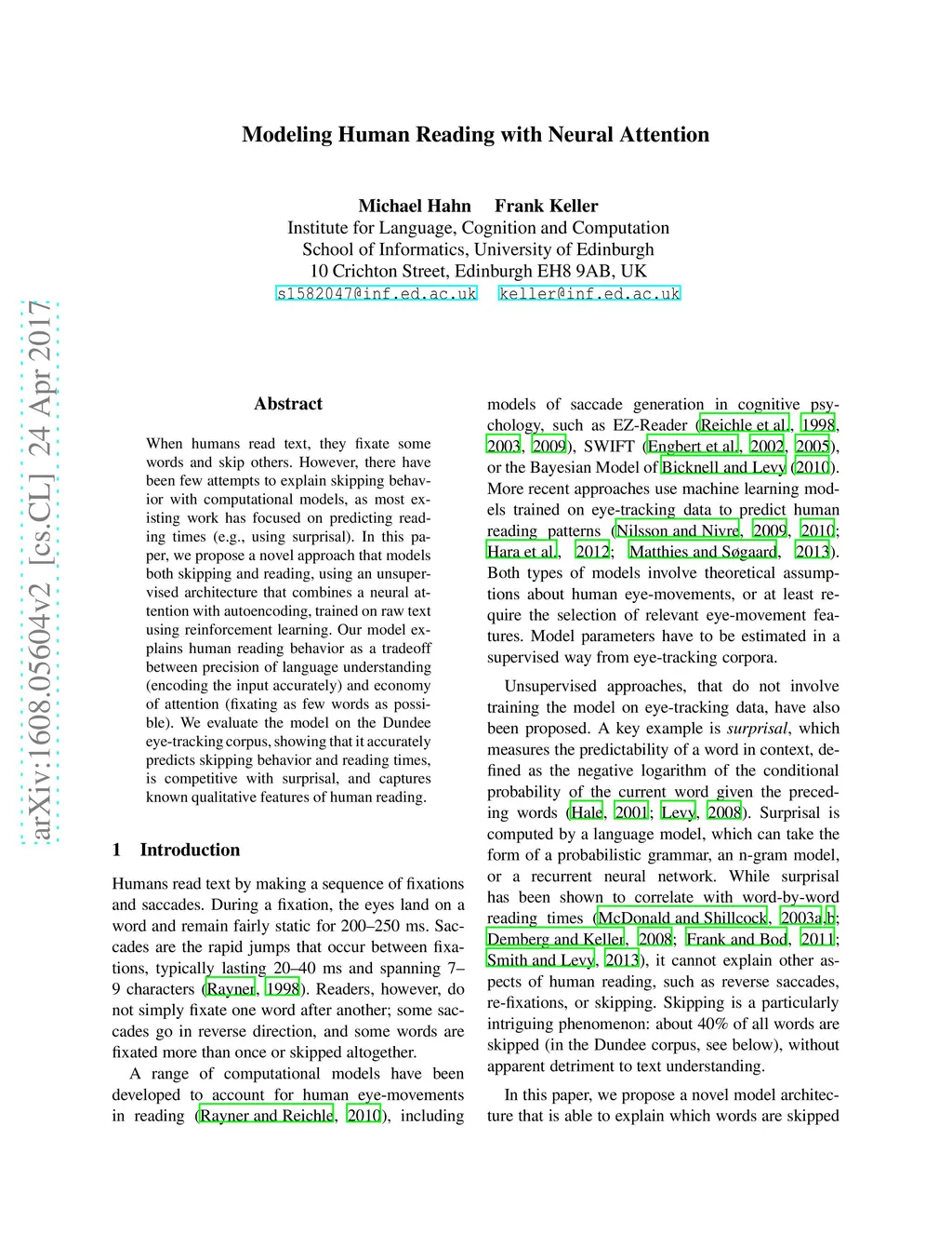 Modeling Human Reading with Neural Attention