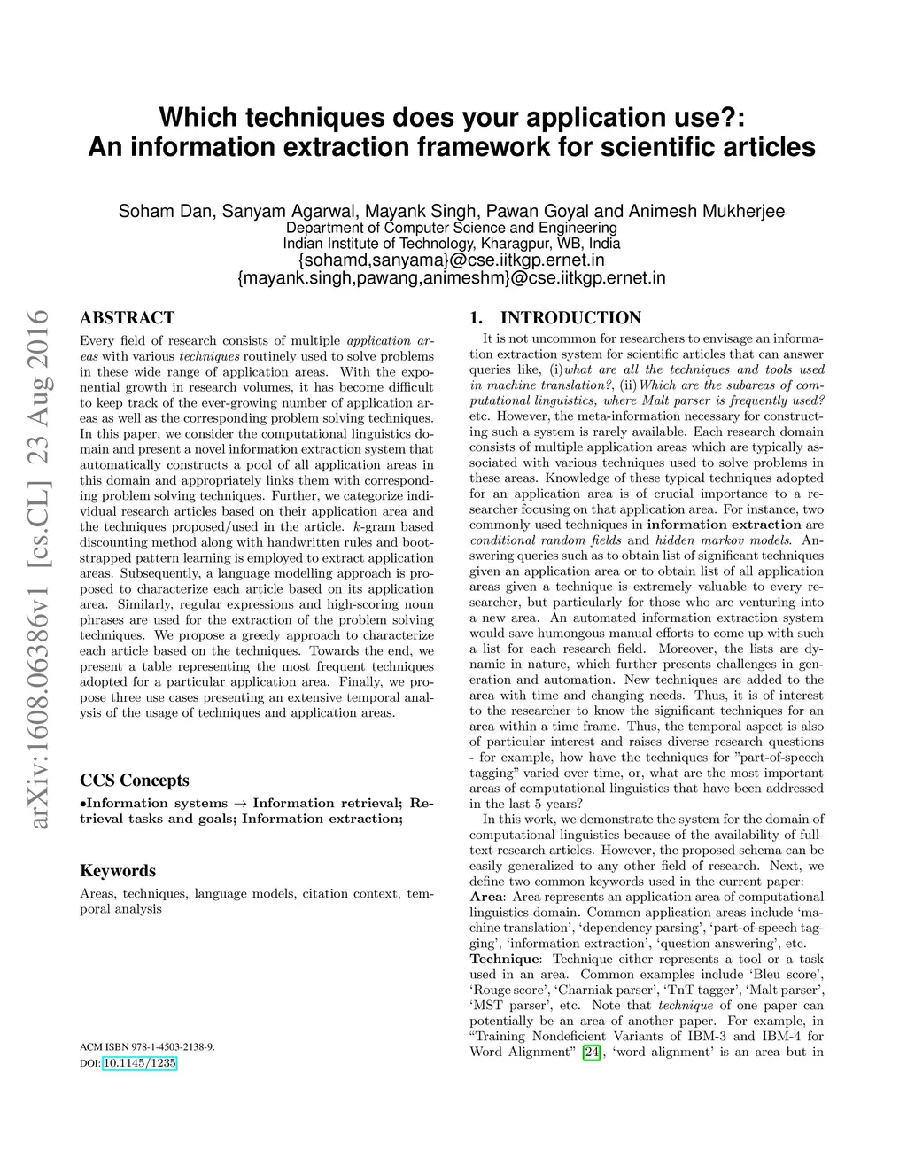 Every field of research consists of multiple application areas with various techniques routinely used to solve problems in these wide range of application areas. With the exponential growth in research volumes, it has become difficult to keep track of the ever-growing number of application areas as well as the corresponding problem solving techniques. In this paper, we consider the computational linguistics domain and present a novel information extraction system that automatically constructs a pool of all application areas in this domain and appropriately links them with corresponding problem solving techniques. Further, we categorize individual research articles based on their application area and the techniques proposed/used in the article. k-gram based discounting method along with handwritten rules and bootstrapped pattern learning is employed to extract application areas. Subsequently, a language modeling approach is proposed to characterize each article based on its application area. Similarly, regular expressions and high-scoring noun phrases are used for the extraction of the problem solving techniques. We propose a greedy approach to characterize each article based on the techniques. Towards the end, we present a table representing the most frequent techniques adopted for a particular application area. Finally, we propose three use cases presenting an extensive temporal analysis of the usage of techniques and application areas.