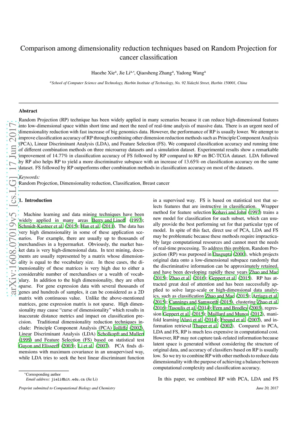 Random Projection (RP) technique has been widely applied in many scenarios because it can reduce high-dimensional features into low-dimensional space within short time and meet the need of real-time analysis of massive data. There is an urgent need of dimensionality reduction with fast increase of big genomics data. However, the performance of RP is usually lower. We attempt to improve classification accuracy of RP through combining other reduction dimension methods such as Principle Component Analysis (PCA), Linear Discriminant Analysis (LDA), and Feature Selection (FS). We compared classification accuracy and running time of different combination methods on three microarray datasets and a simulation dataset. Experimental results show a remarkable improvement of 14.77% in classification accuracy of FS followed by RP compared to RP on BC-TCGA dataset. LDA followed by RP also helps RP to yield a more discriminative subspace with an increase of 13.65% on classification accuracy on the same dataset. FS followed by RP outperforms other combination methods in classification accuracy on most of the datasets.