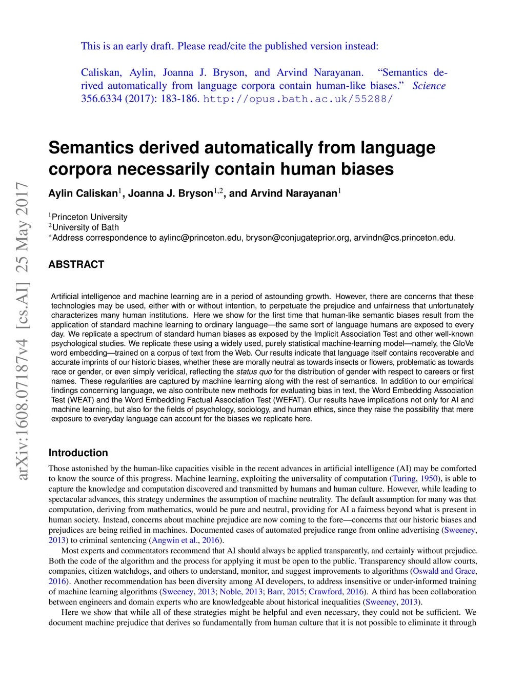 Artificial intelligence and machine learning are in a period of astounding growth. However, there are concerns that these technologies may be used, either with or without intention, to perpetuate the prejudice and unfairness that unfortunately characterizes many human institutions. Here we show for the first time that human-like semantic biases result from the application of standard machine learning to ordinary language---the same sort of language humans are exposed to every day. We replicate a spectrum of standard human biases as exposed by the Implicit Association Test and other well-known psychological studies. We replicate these using a widely used, purely statistical machine-learning model---namely, the GloVe word embedding---trained on a corpus of text from the Web. Our results indicate that language itself contains recoverable and accurate imprints of our historic biases, whether these are morally neutral as towards insects or flowers, problematic as towards race or gender, or even simply veridical, reflecting the status quo for the distribution of gender with respect to careers or first names. These regularities are captured by machine learning along with the rest of semantics. In addition to our empirical findings concerning language, we also contribute new methods for evaluating bias in text, the Word Embedding Association Test (WEAT) and the Word Embedding Factual Association Test (WEFAT). Our results have implications not only for AI and machine learning, but also for the fields of psychology, sociology, and human ethics, since they raise the possibility that mere exposure to everyday language can account for the biases we replicate here.