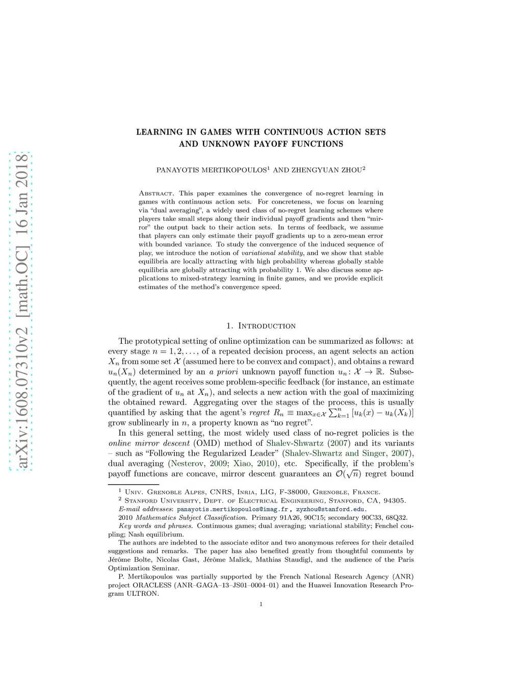 This paper examines the convergence of no-regret learning in games with continuous action sets. For concreteness, we focus on learning via "dual averaging", a widely used class of no-regret learning schemes where players take small steps along their individual payoff gradients and then "mirror" the output back to their action sets. In terms of feedback, we assume that players can only estimate their payoff gradients up to a zero-mean error with bounded variance. To study the convergence of the induced sequence of play, we introduce the notion of variational stability, and we show that stable equilibria are locally attracting with high probability whereas globally stable equilibria are globally attracting with probability 1. We also discuss some applications to mixed-strategy learning in finite games, and we provide explicit estimates of the method's convergence speed.