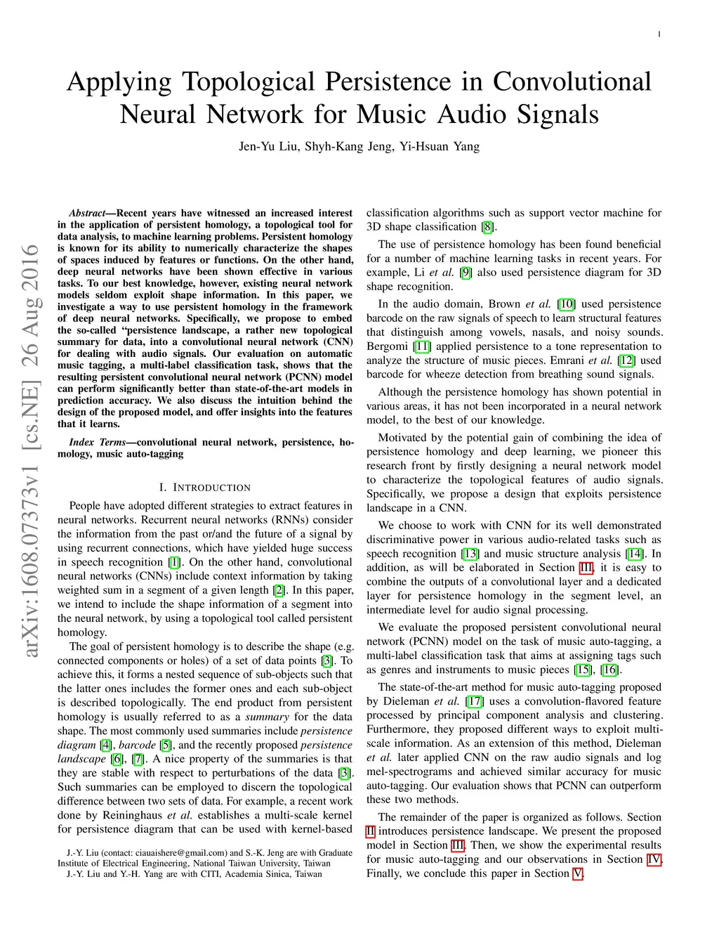 Recent years have witnessed an increased interest in the application of persistent homology, a topological tool for data analysis, to machine learning problems. Persistent homology is known for its ability to numerically characterize the shapes of spaces induced by features or functions. On the other hand, deep neural networks have been shown effective in various tasks. To our best knowledge, however, existing neural network models seldom exploit shape information. In this paper, we investigate a way to use persistent homology in the framework of deep neural networks. Specifically, we propose to embed the so-called "persistence landscape," a rather new topological summary for data, into a convolutional neural network (CNN) for dealing with audio signals. Our evaluation on automatic music tagging, a multi-label classification task, shows that the resulting persistent convolutional neural network (PCNN) model can perform significantly better than state-of-the-art models in prediction accuracy. We also discuss the intuition behind the design of the proposed model, and offer insights into the features that it learns.
