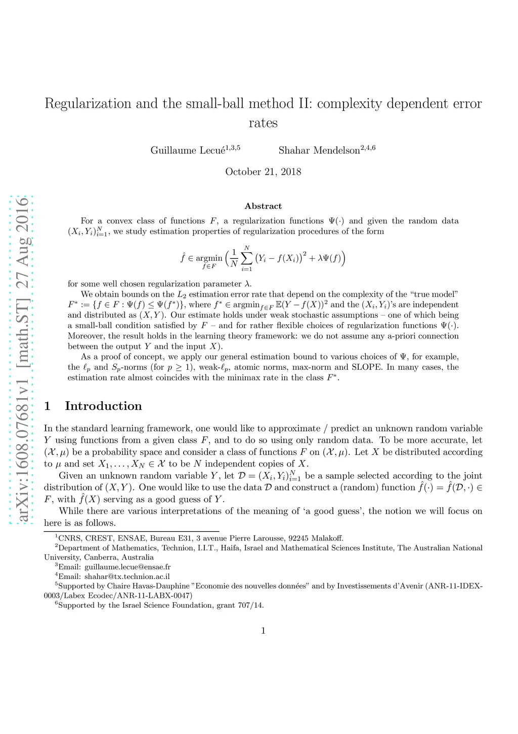 For a convex class of functions , a regularization functions and given the random data , we study estimation properties of regularization procedures of the form \begin{equation*} \hat f \in {\rm argmin}_{f\in F}\Big(\frac{1}{N}\sum_{i=1}^N\big(Y_i-f(X_i)\big)^2+\lambda \Psi(f)\Big) \end{equation*} for some well chosen regularization parameter . We obtain bounds on the estimation error rate that depend on the complexity of the "true model" , where and the 's are independent and distributed as . Our estimate holds under weak stochastic assumptions -- one of which being a small-ball condition satisfied by -- and for rather flexible choices of regularization functions . Moreover, the result holds in the learning theory framework: we do not assume any a-priori connection between the output and the input . As a proof of concept, we apply our general estimation bound to various choices of , for example, the and -norms (for ), weak-, atomic norms, max-norm and SLOPE. In many cases, the estimation rate almost coincides with the minimax rate in the class .