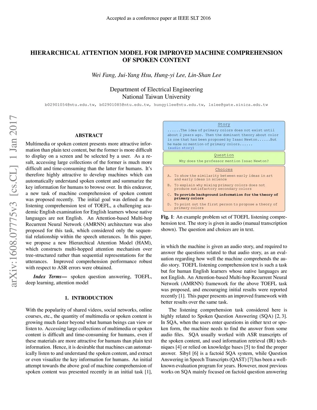 Multimedia or spoken content presents more attractive information than plain text content, but the former is more difficult to display on a screen and be selected by a user. As a result, accessing large collections of the former is much more difficult and time-consuming than the latter for humans. It's therefore highly attractive to develop machines which can automatically understand spoken content and summarize the key information for humans to browse over. In this endeavor, a new task of machine comprehension of spoken content was proposed recently. The initial goal was defined as the listening comprehension test of TOEFL, a challenging academic English examination for English learners whose native languages are not English. An Attention-based Multi-hop Recurrent Neural Network (AMRNN) architecture was also proposed for this task, which considered only the sequential relationship within the speech utterances. In this paper, we propose a new Hierarchical Attention Model (HAM), which constructs multi-hopped attention mechanism over tree-structured rather than sequential representations for the utterances. Improved comprehension performance robust with respect to ASR errors were obtained.