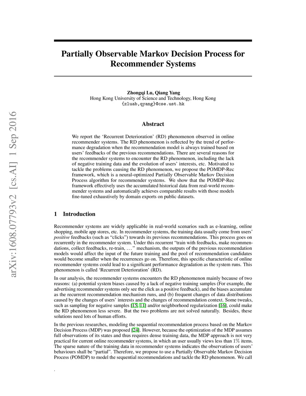 We report the "Recurrent Deterioration" (RD) phenomenon observed in online recommender systems. The RD phenomenon is reflected by the trend of performance degradation when the recommendation model is always trained based on users' feedbacks of the previous recommendations. There are several reasons for the recommender systems to encounter the RD phenomenon, including the lack of negative training data and the evolution of users' interests, etc. Motivated to tackle the problems causing the RD phenomenon, we propose the POMDP-Rec framework, which is a neural-optimized Partially Observable Markov Decision Process algorithm for recommender systems. We show that the POMDP-Rec framework effectively uses the accumulated historical data from real-world recommender systems and automatically achieves comparable results with those models fine-tuned exhaustively by domain exports on public datasets.