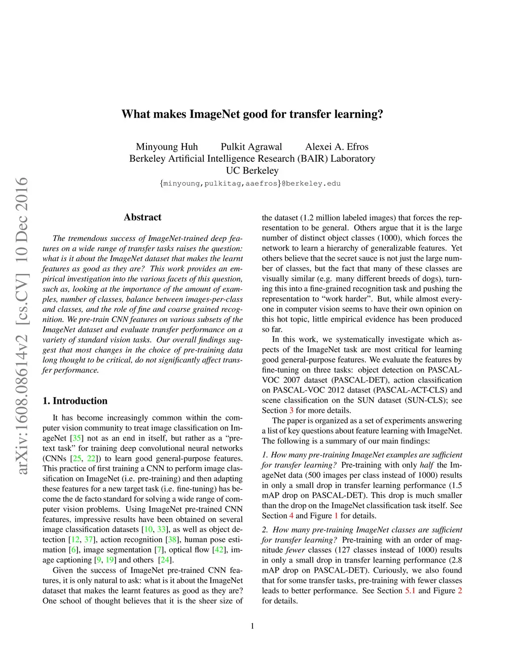 The tremendous success of ImageNet-trained deep features on a wide range of transfer tasks begs the question: what are the properties of the ImageNet dataset that are critical for learning good, general-purpose features? This work provides an empirical investigation of various facets of this question: Is more pre-training data always better? How does feature quality depend on the number of training examples per class? Does adding more object classes improve performance? For the same data budget, how should the data be split into classes? Is fine-grained recognition necessary for learning good features? Given the same number of training classes, is it better to have coarse classes or fine-grained classes? Which is better: more classes or more examples per class? To answer these and related questions, we pre-trained CNN features on various subsets of the ImageNet dataset and evaluated transfer performance on PASCAL detection, PASCAL action classification, and SUN scene classification tasks. Our overall findings suggest that most changes in the choice of pre-training data long thought to be critical do not significantly affect transfer performance.? Given the same number of training classes, is it better to have coarse classes or fine-grained classes? Which is better: more classes or more examples per class?